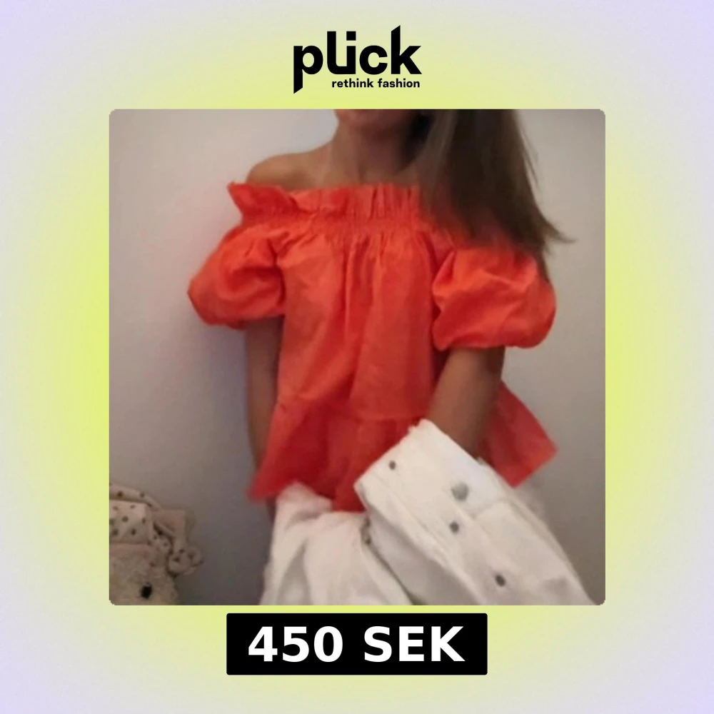 Superfin orange blus med offshoulder-modell och bred resår upptill. Puffiga korta ärmar och luftig passform gör den perfekt för varma dagar. Tunt, lätt tyg som ger en skön känsla och snygg volym. Perfekt att styla med shorts eller kjol för en trendig look.
