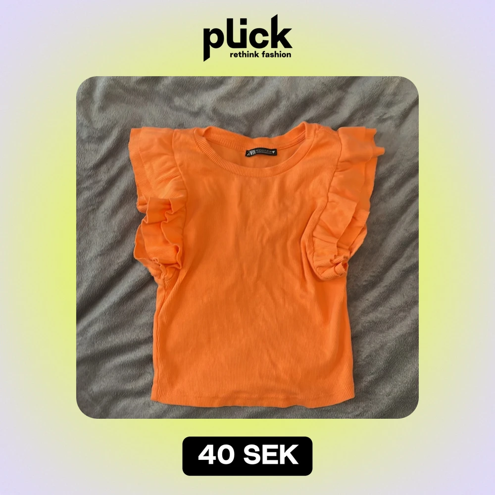 Säljer en superfin orange ribbad topp från Zara i storlek S. Den har volangdetaljer vid ärmarna som ger en söt touch. Toppen är i mycket bra skick!