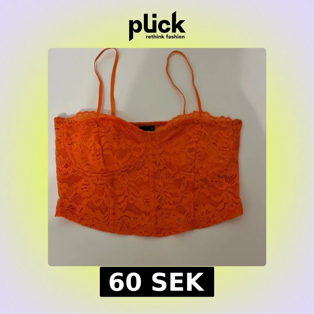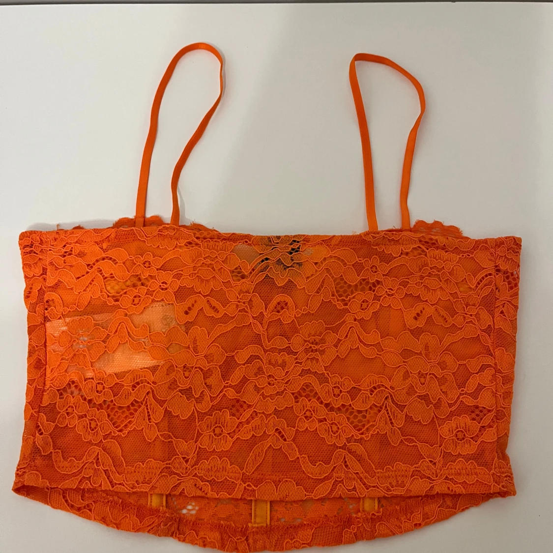 Säljer en orange topp med tunna axelband och vacker spets över hela plagget. Perfekt till tex neonfest💕