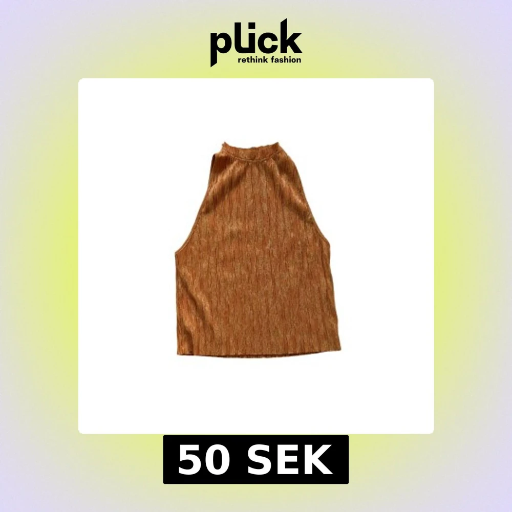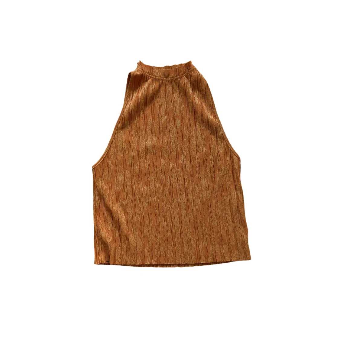 Snygg orange topp med hög hals och ärmlös design. Perfekt för dig som vill ha en trendig och bekväm topp med lite glansig finish och retrovibbar.