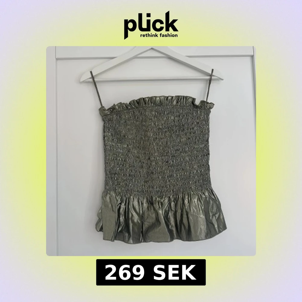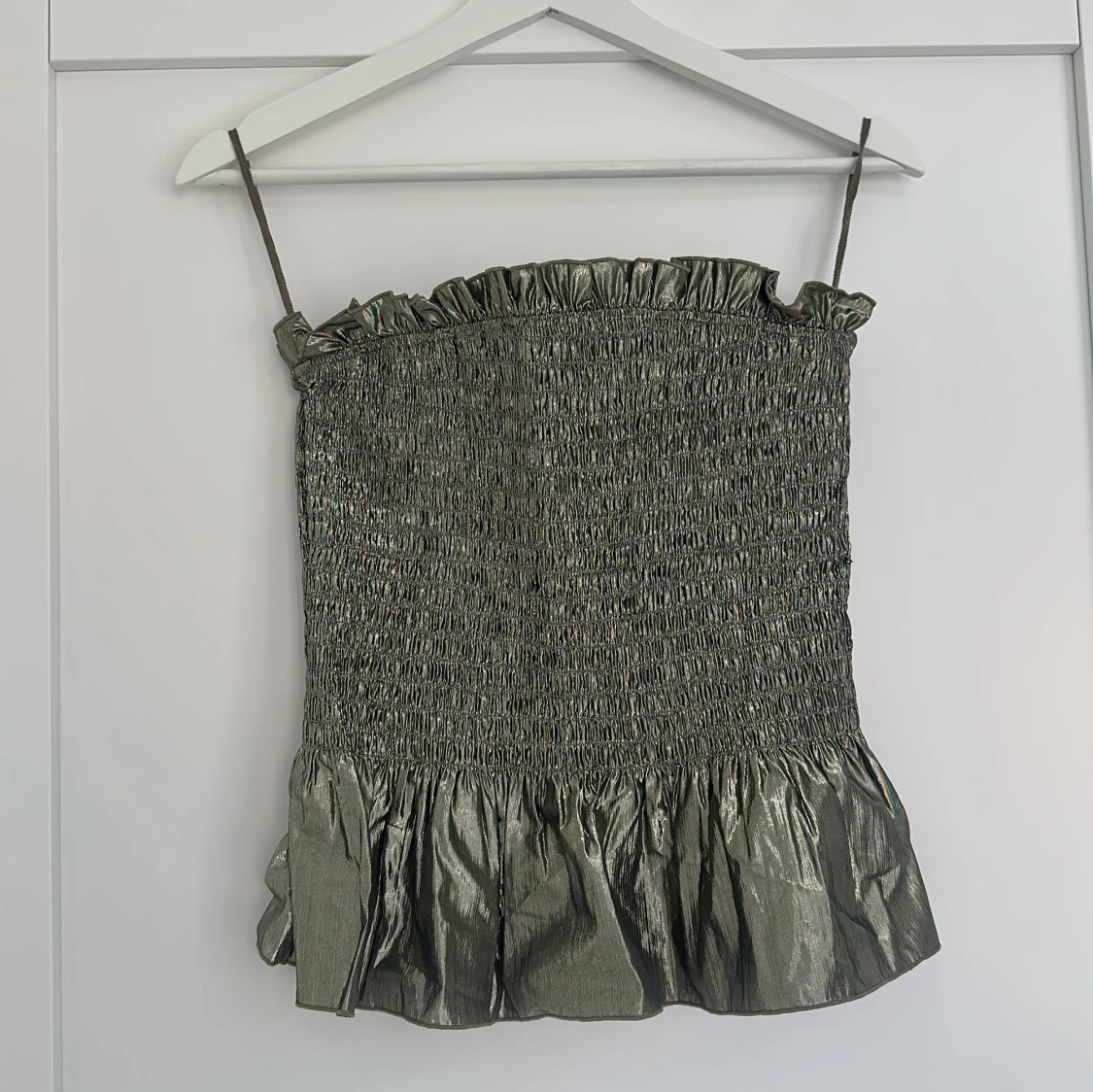 Supersnygg glittrig grå linnetopp från & Other Stories med smockad struktur och volangkant nertill. Tunt axelbandslinne med metallic finish som verkligen sticker ut. Perfekt för dig som vill ha något extra till outfiten!