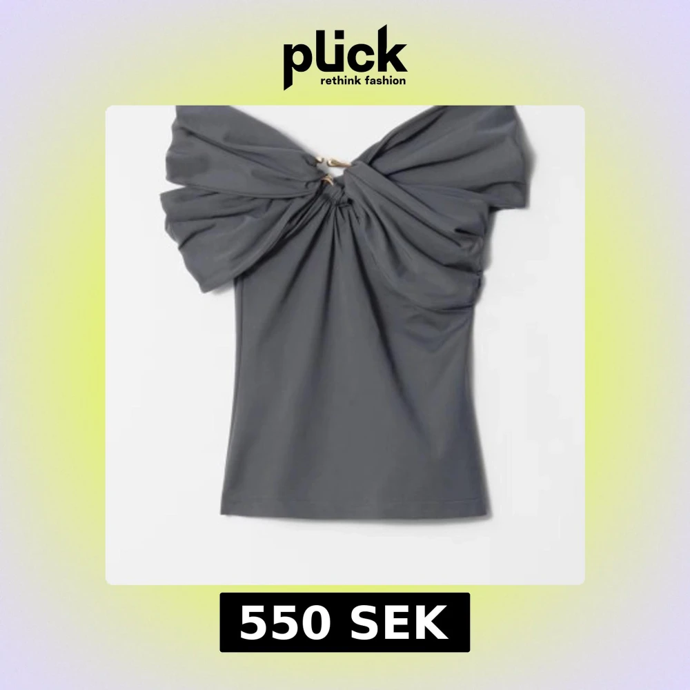 Snygg grå topp med omlott-design och stora volanger över axlarna. Toppen är off shoulder och har en fyndig detalj fram. Bara använd en gång och säljer för att jag inte passar i den. Nypris 690kr💕💕
