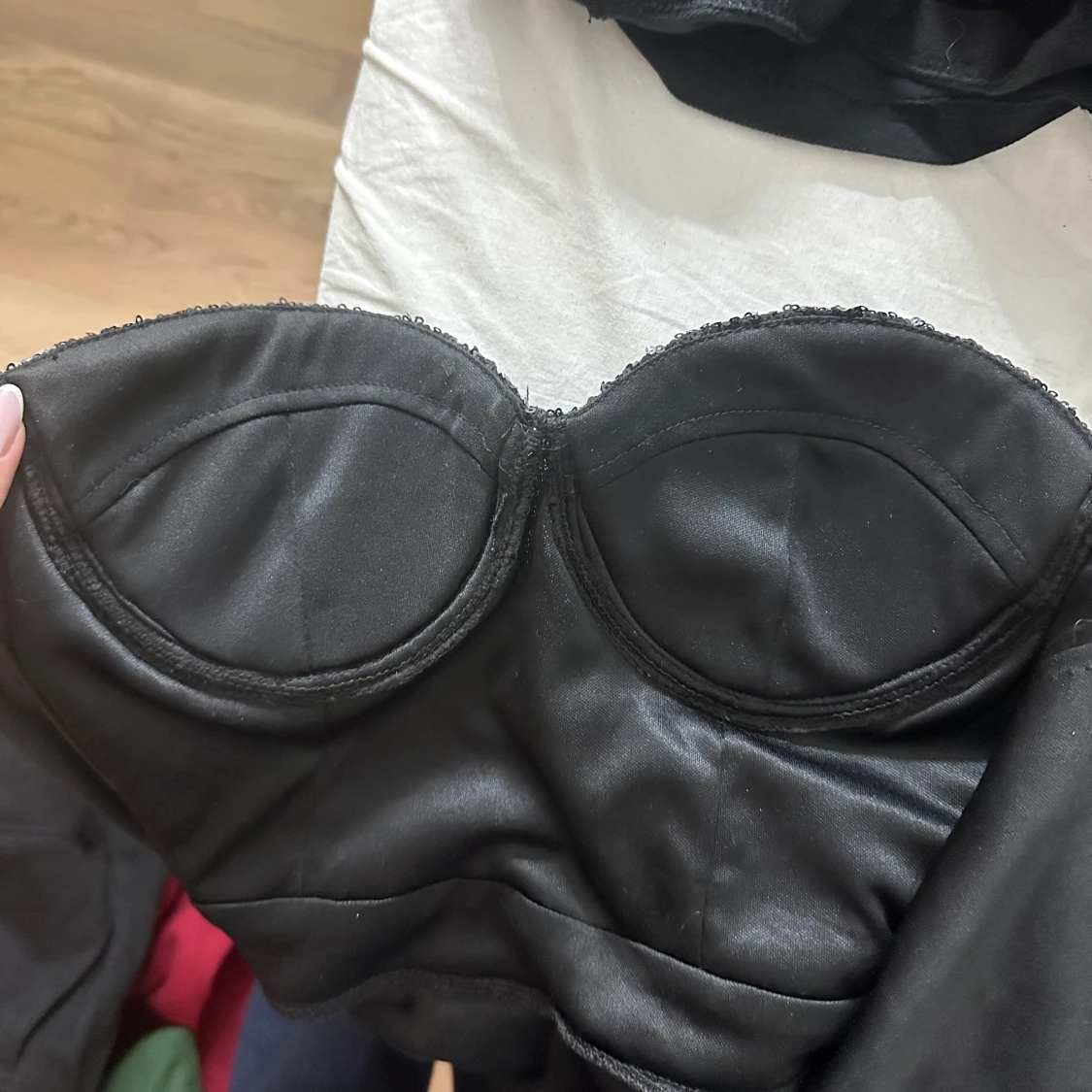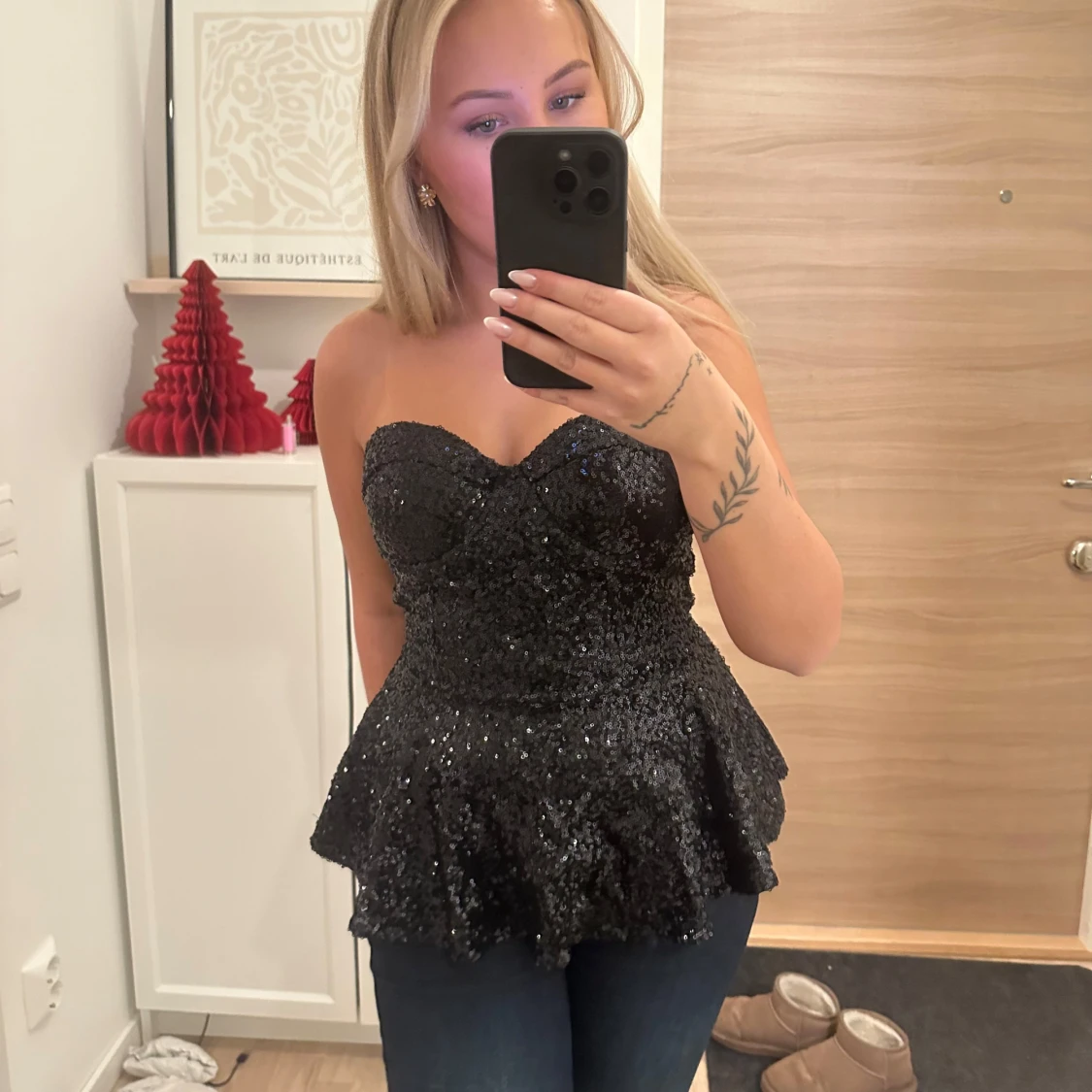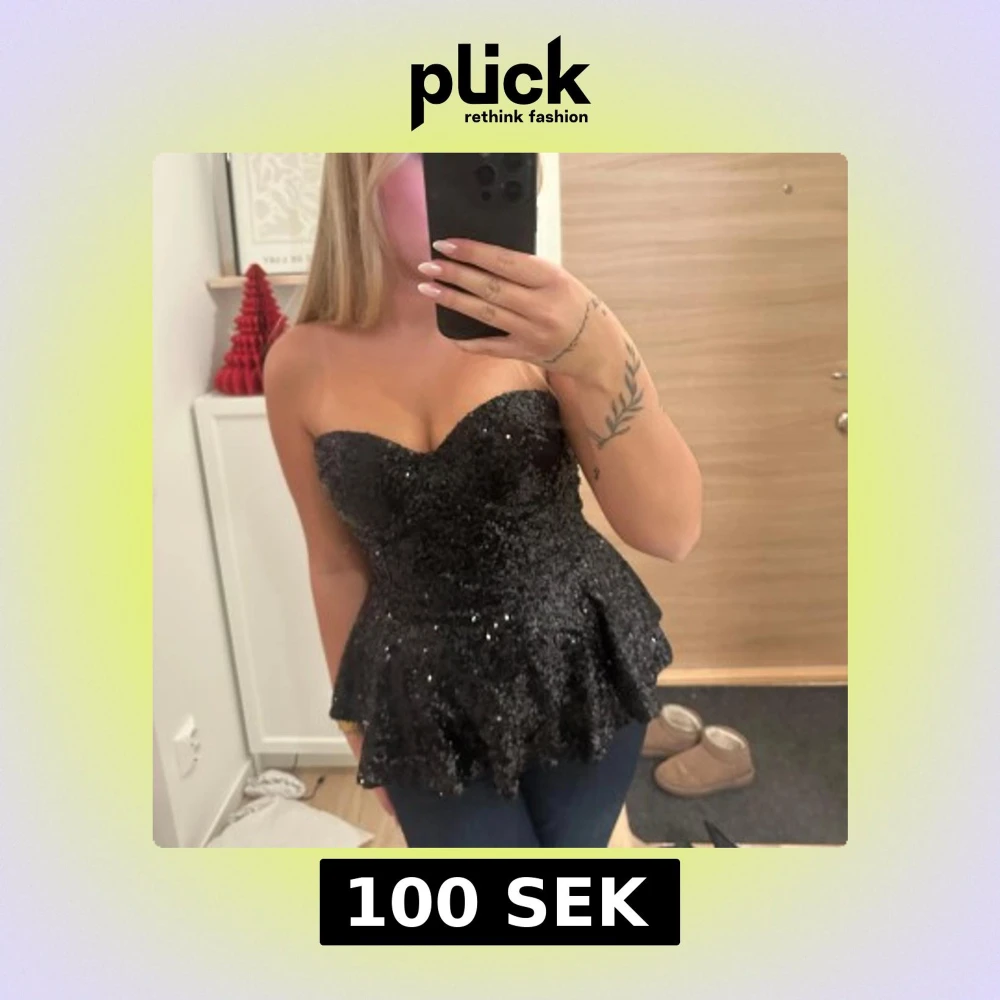 Fin glittrig topp utan axelband. Finns dragkedja i ryggen. Saknas lapp i, så är osäker på märke och storlek. Skulle säga S/M väldigt stretchigt material❤️