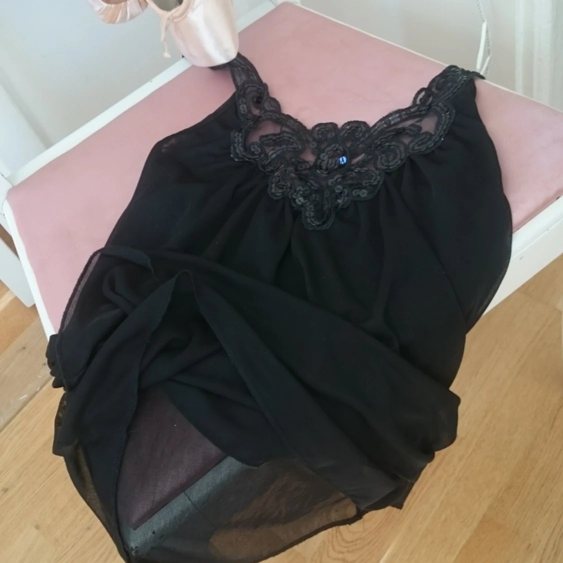 Svart halterneck topp med paljetter med chiffongliknande genomskinligt tyg i två lager. Storlek 34.