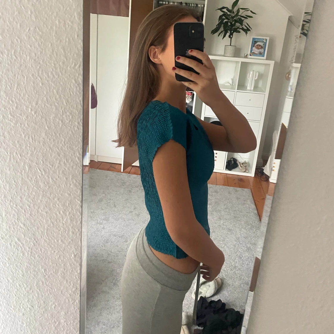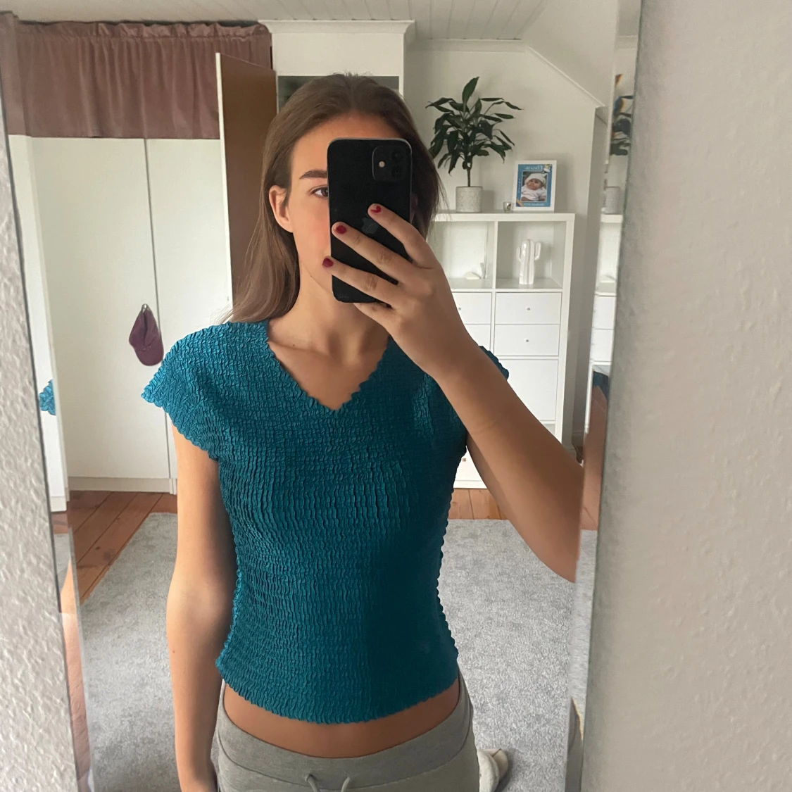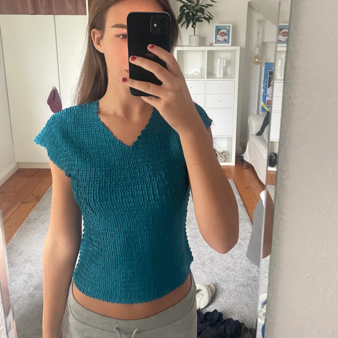 Fin och unik partytopp som är skimrande i materialet, väldigt unik och format kroppen väldigt snyggt, oklar storlek men passar mig som har storlek S