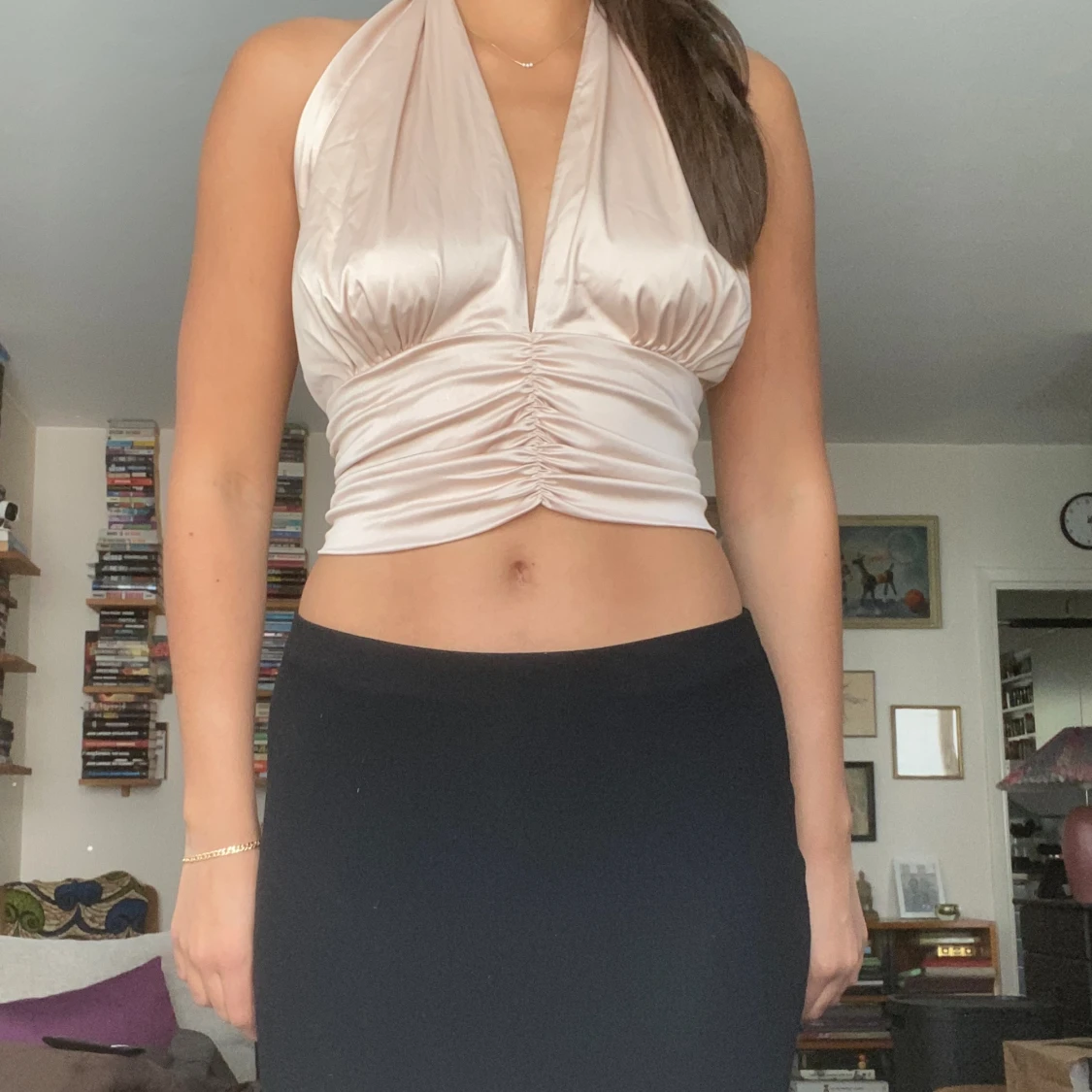 En festligare topp i en jättefin champagnefärg. Säljer då den tyvärr inte kommer till användning. Går att justera passformen men hjälp av banden runt nacken. Endast använd en gång💗 storlek M men passar mig som brukar ha S i toppar.