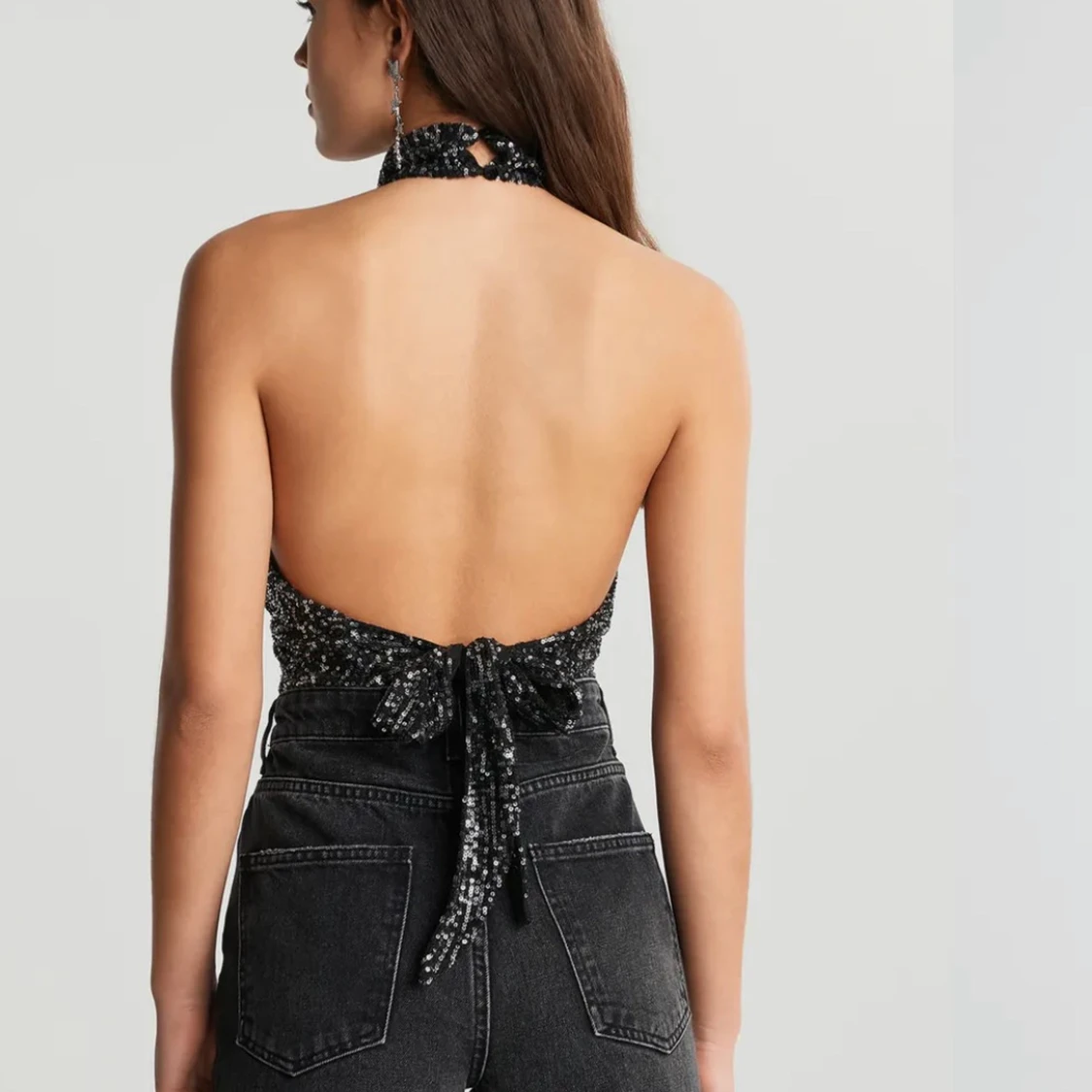 Glittrig topp med öppen rygg från Gina, storlek XS/S. Endast använd en gång, nyskick!