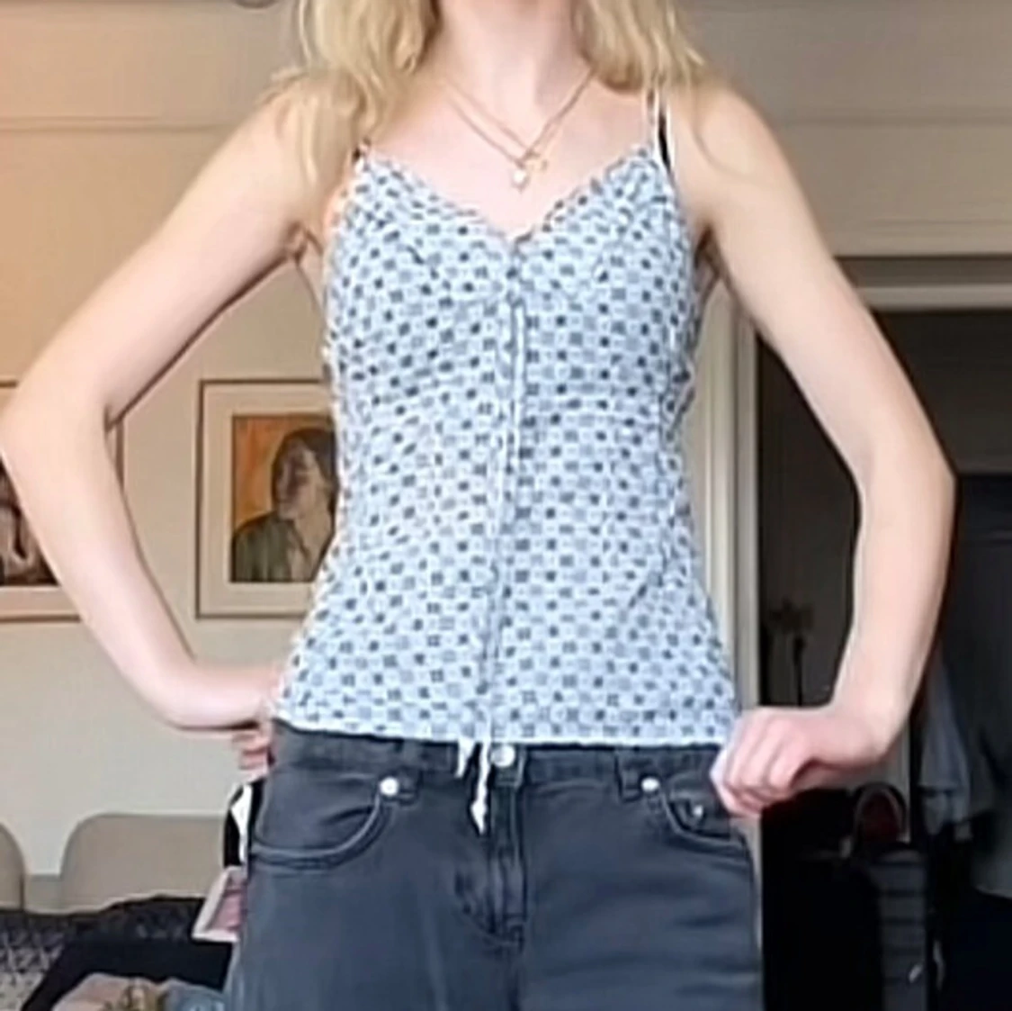 Supersöt blå/svart/vit linne med små blommor och smala axelband. Toppen har snörning framtill som ger en extra detalj och en feminin v-ringning.