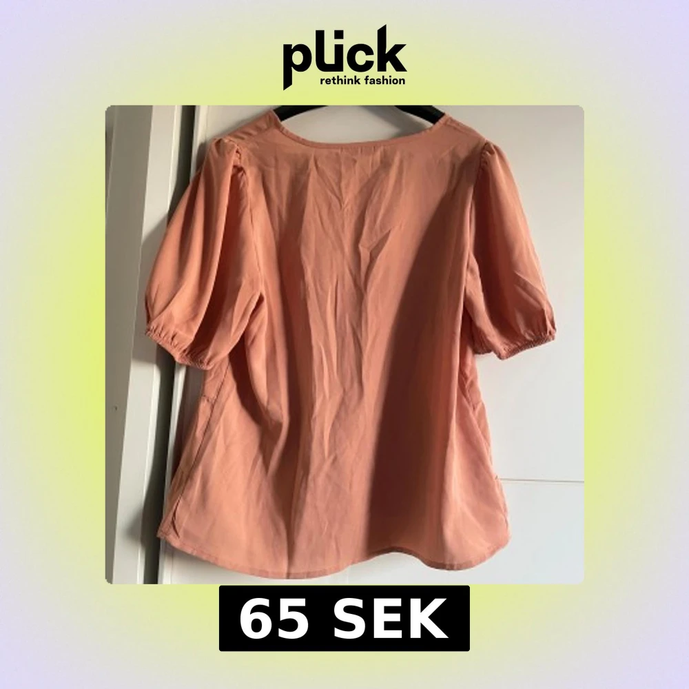 Säljer en söt persikofärgad blus med korta puffärmar och rund halsringning.