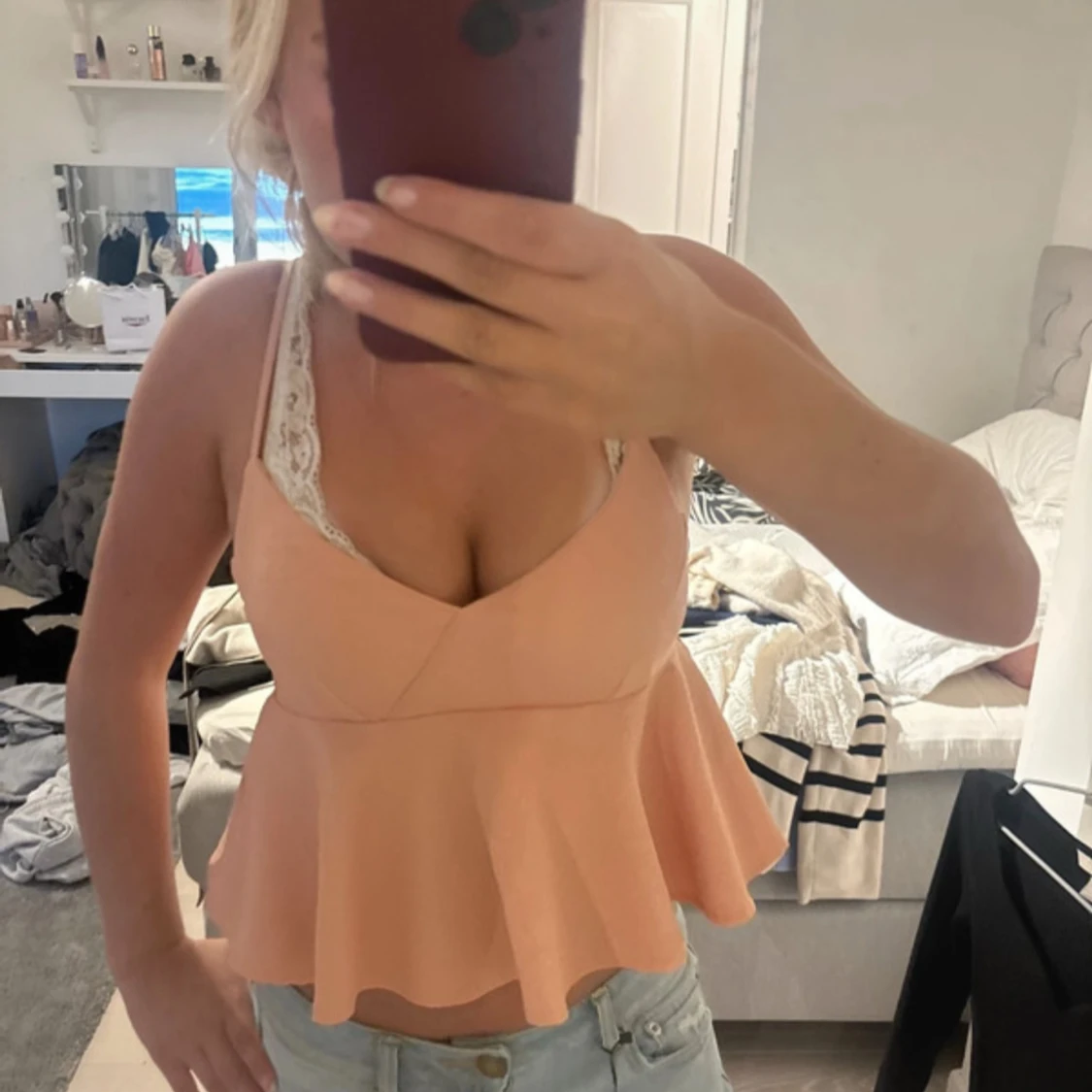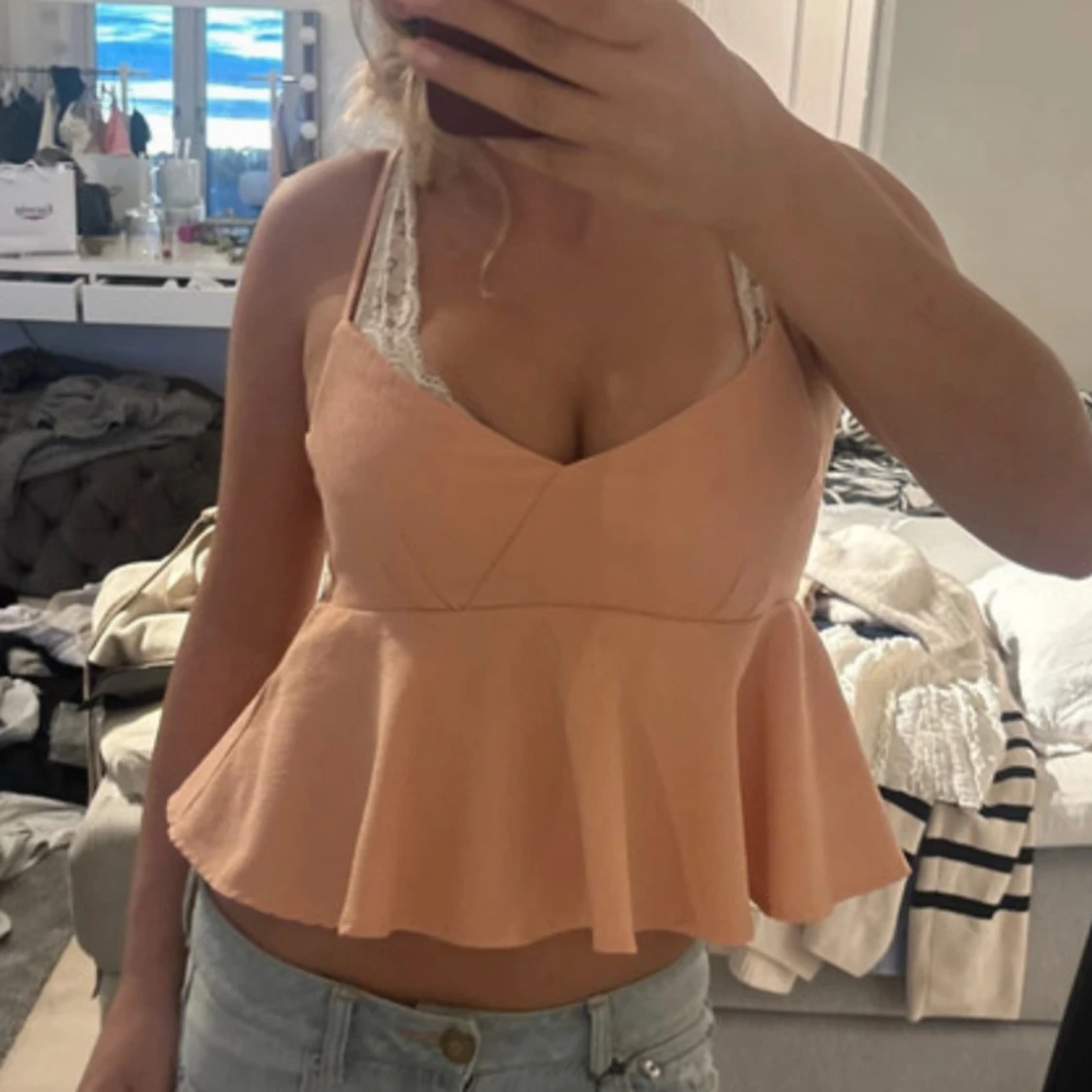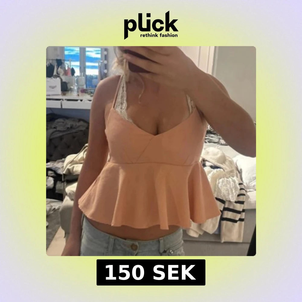 Säljer en söt persikofärgad linnetopp med peplumvolang och smala axelband. Toppen har en v-ringad skärning och är croppad, vilket ger en fräsch och ungdomlig look. Perfekt till jeans eller kjol för en chill sommarstil.