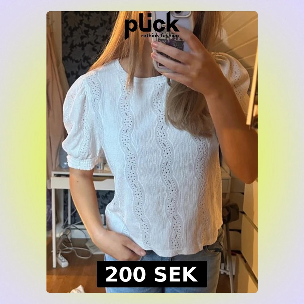 Säljer en vit blus från pieces med korta puffärmar och rund hals. Blusen har vågiga broderade detaljer och är tillverkad i ett lätt, strukturerat bomullstyg. Perfekt för dig som gillar romantisk och söt stil. Passar till jeans eller kjol.