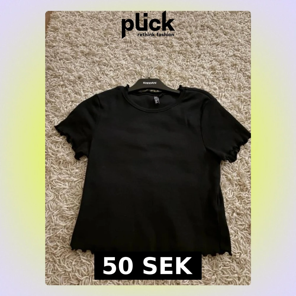 Svart ribbad topp från PIECES med korta ärmar och vågiga kanter vid ärmslut och nederkant. Enkel och stilren design som passar till det mesta. Tillverkad i mjukt material för en bekväm känsla. Den känns som storlek S