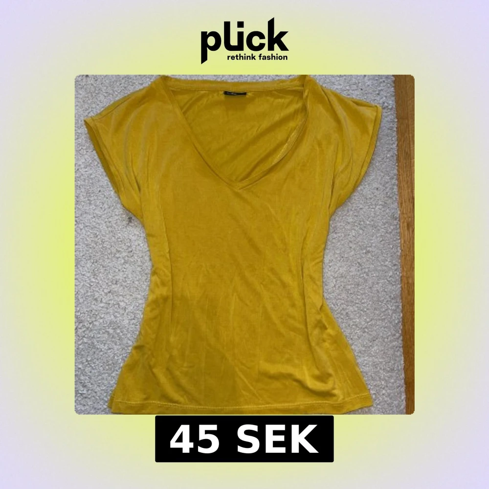 Säljer en solgul v-ringad topp från Pieces. Den har en enkel och stilren design med korta ärmar och en figurnära passform. Knappt använd och i nyskick.