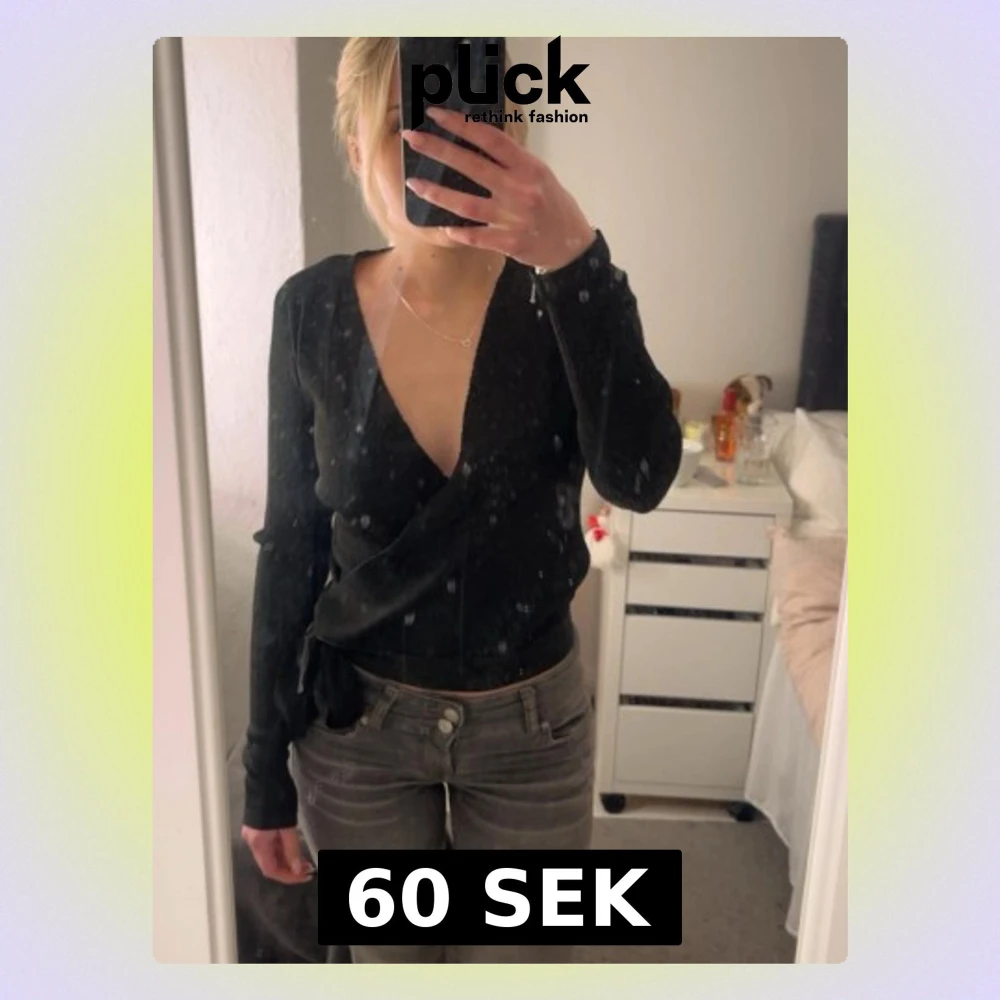 Säljer en svart omlottopp med knyt i sidan, från märket pieces.