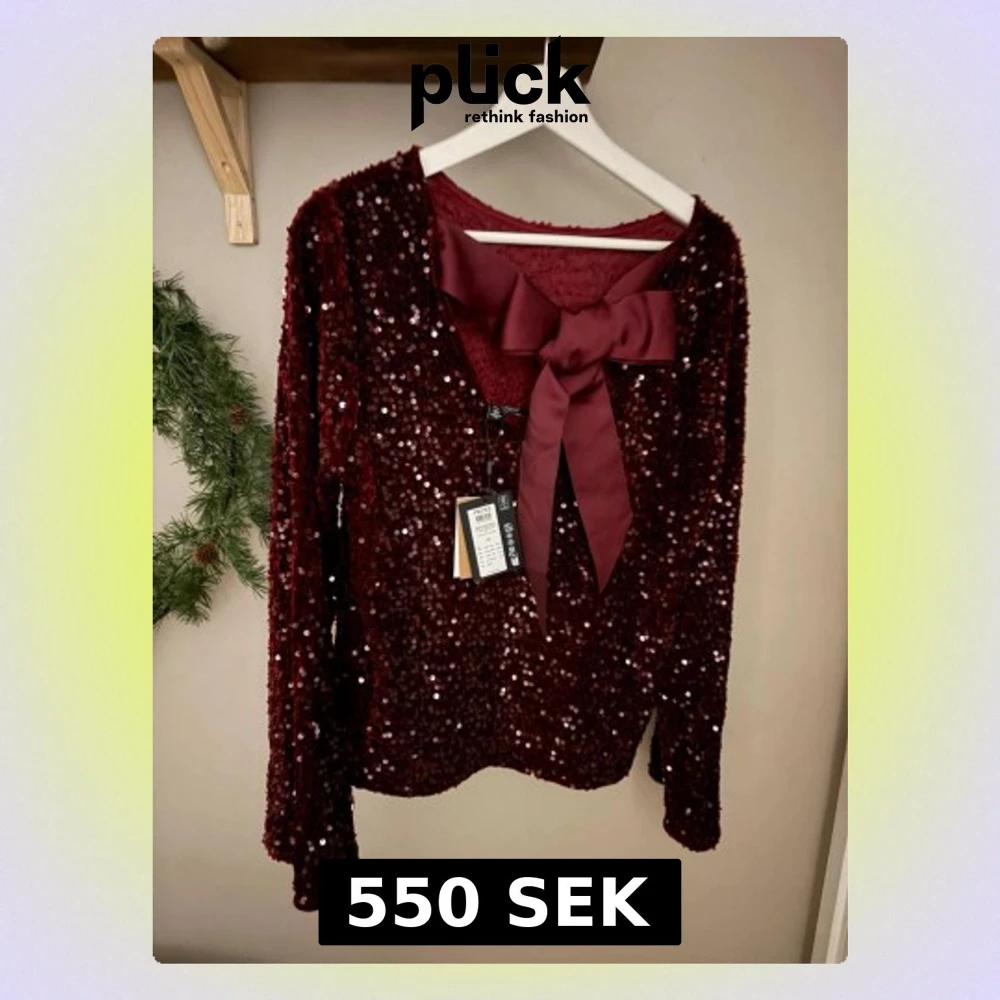 Vinröd blus från Pieces, täckt med glittriga paljetter och en stor matchande rosett baktill. Blusen har lång utställd arm och en mjuk, rundad halsringning. Perfekt för att sticka ut på speciella tillfällen. Snygg och festlig design med skön passform. Säljer den ny med lapp kvar då den blev förstor