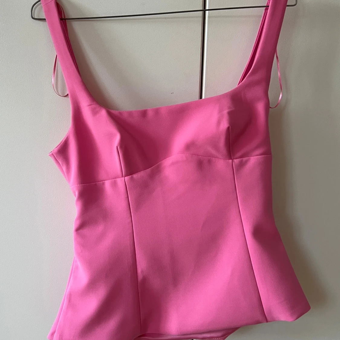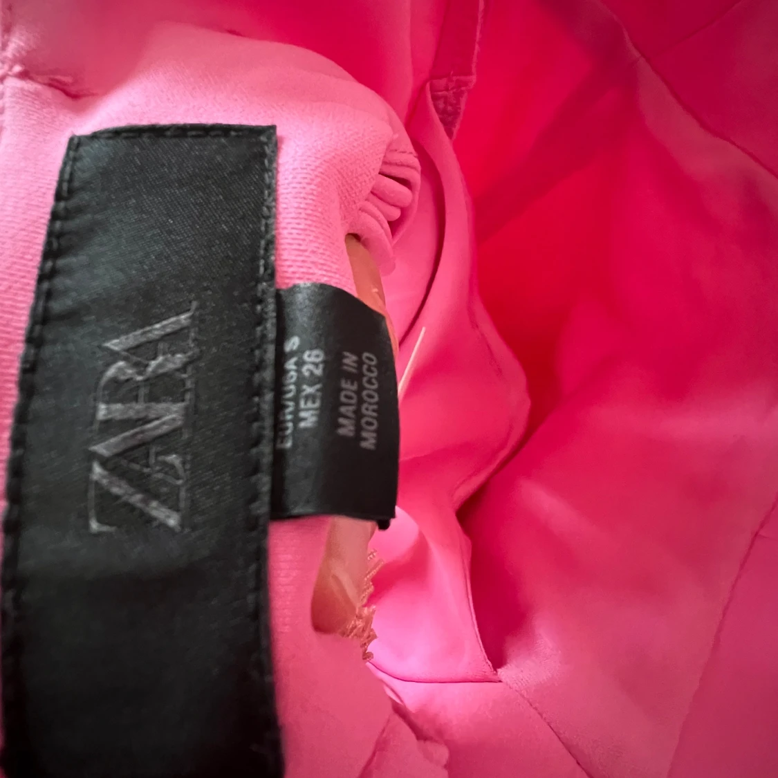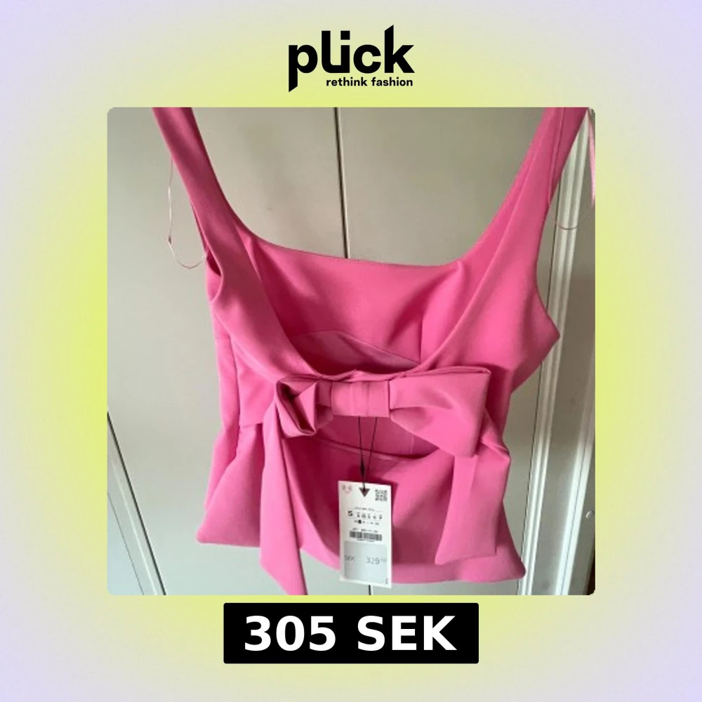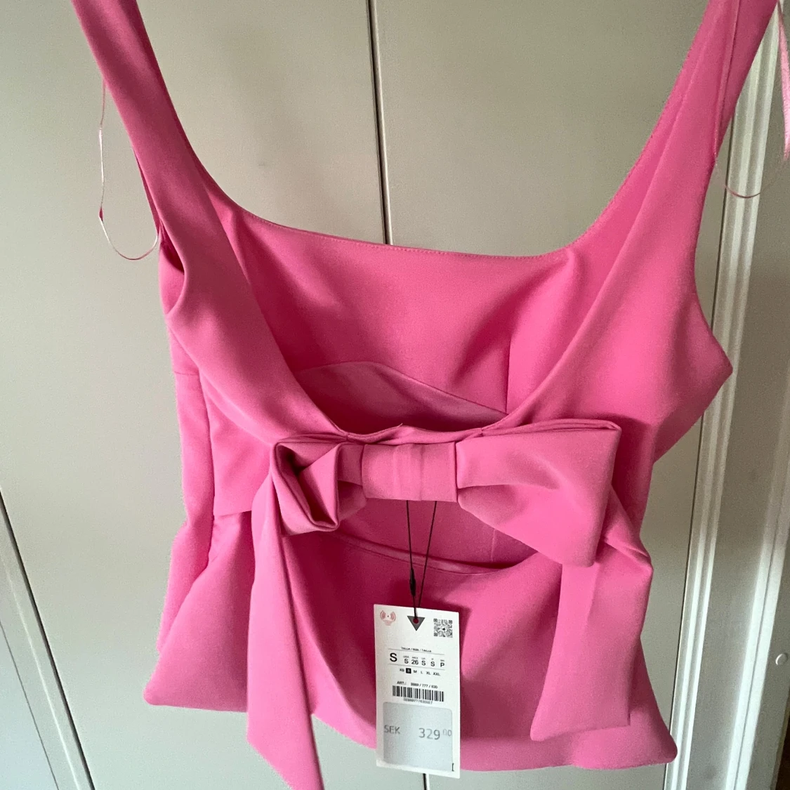 Supersöt rosa topp från Zara med breda axelband och en stor rosett baktill. Toppen har en snygg cut-out detalj under rosetten och är figursydd med lätt utsvängd nederkant. Perfekt festtopp etc Ej använd och prislapp kvar
