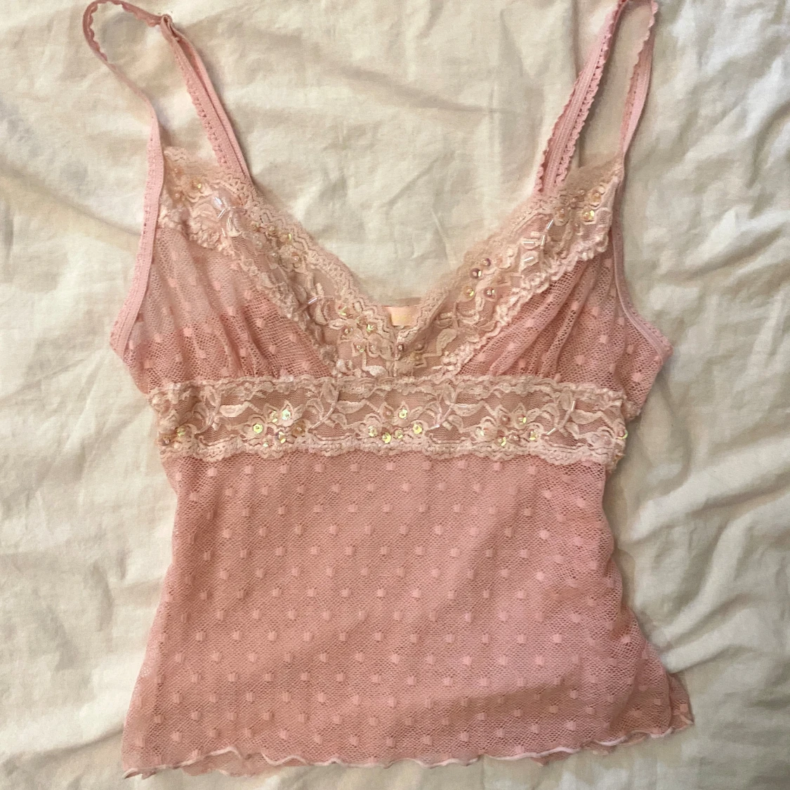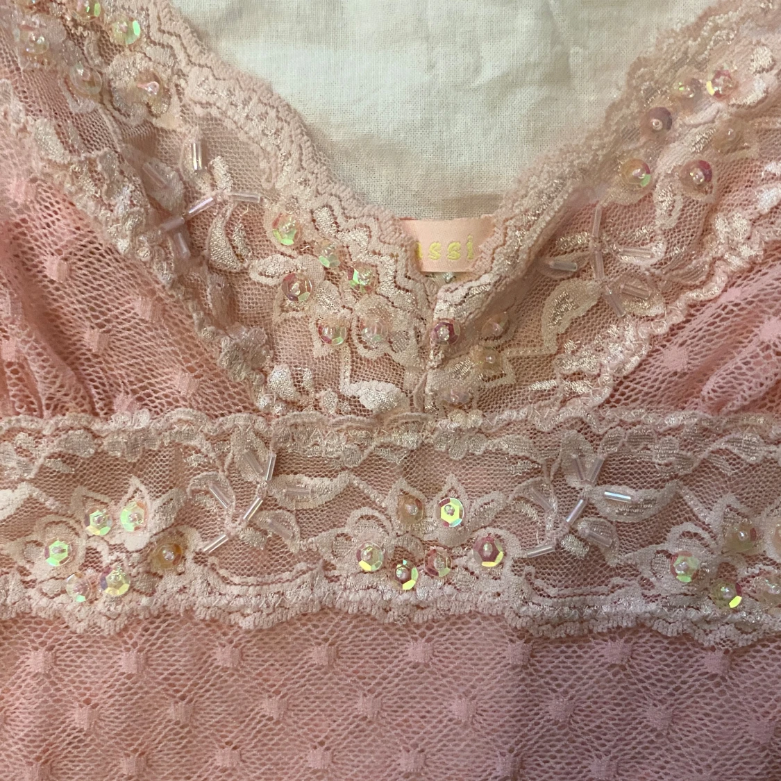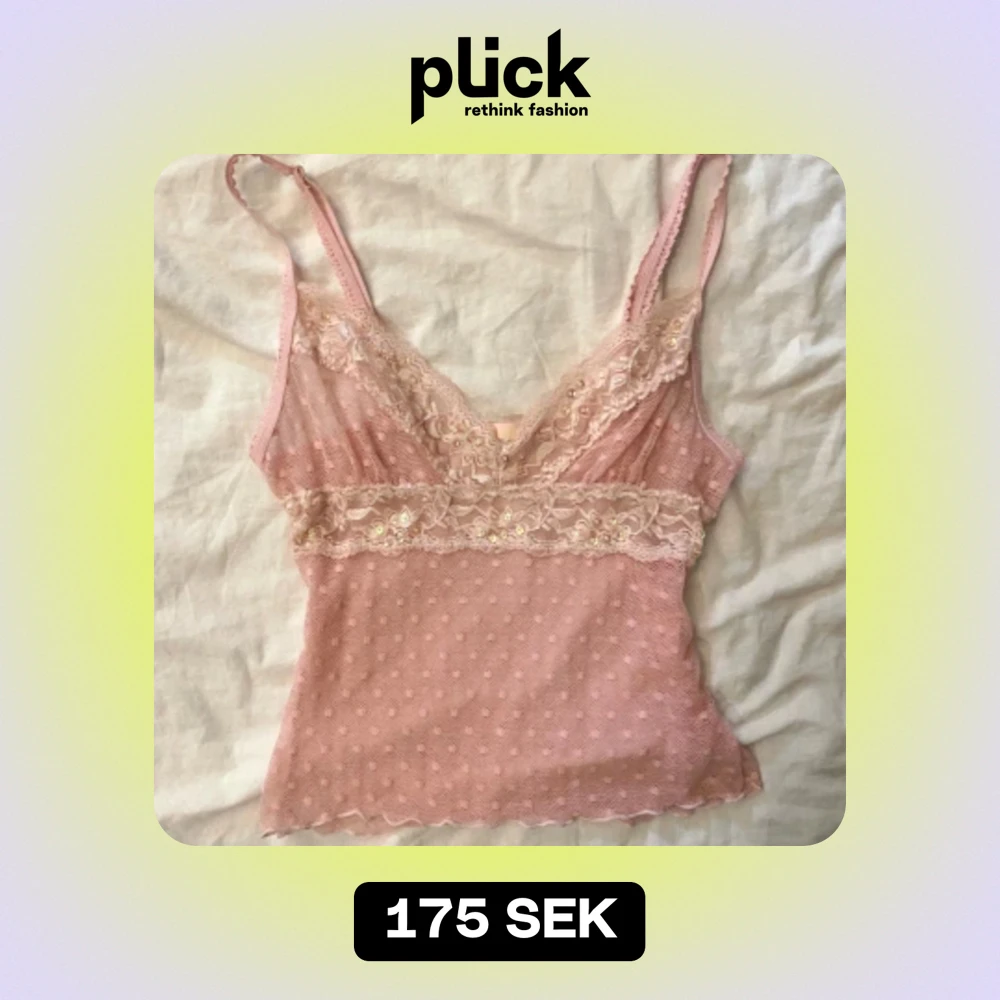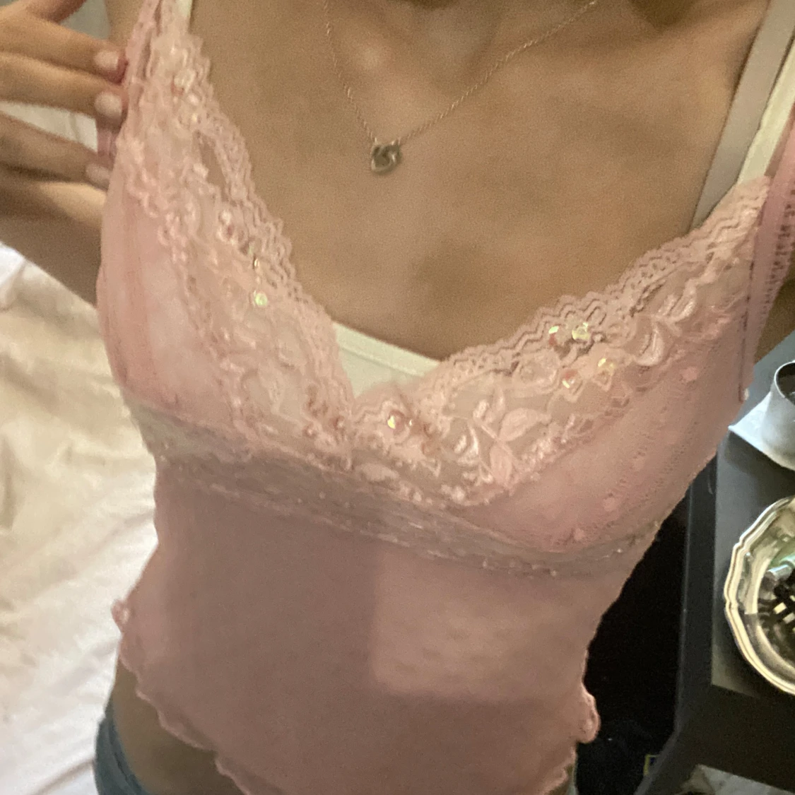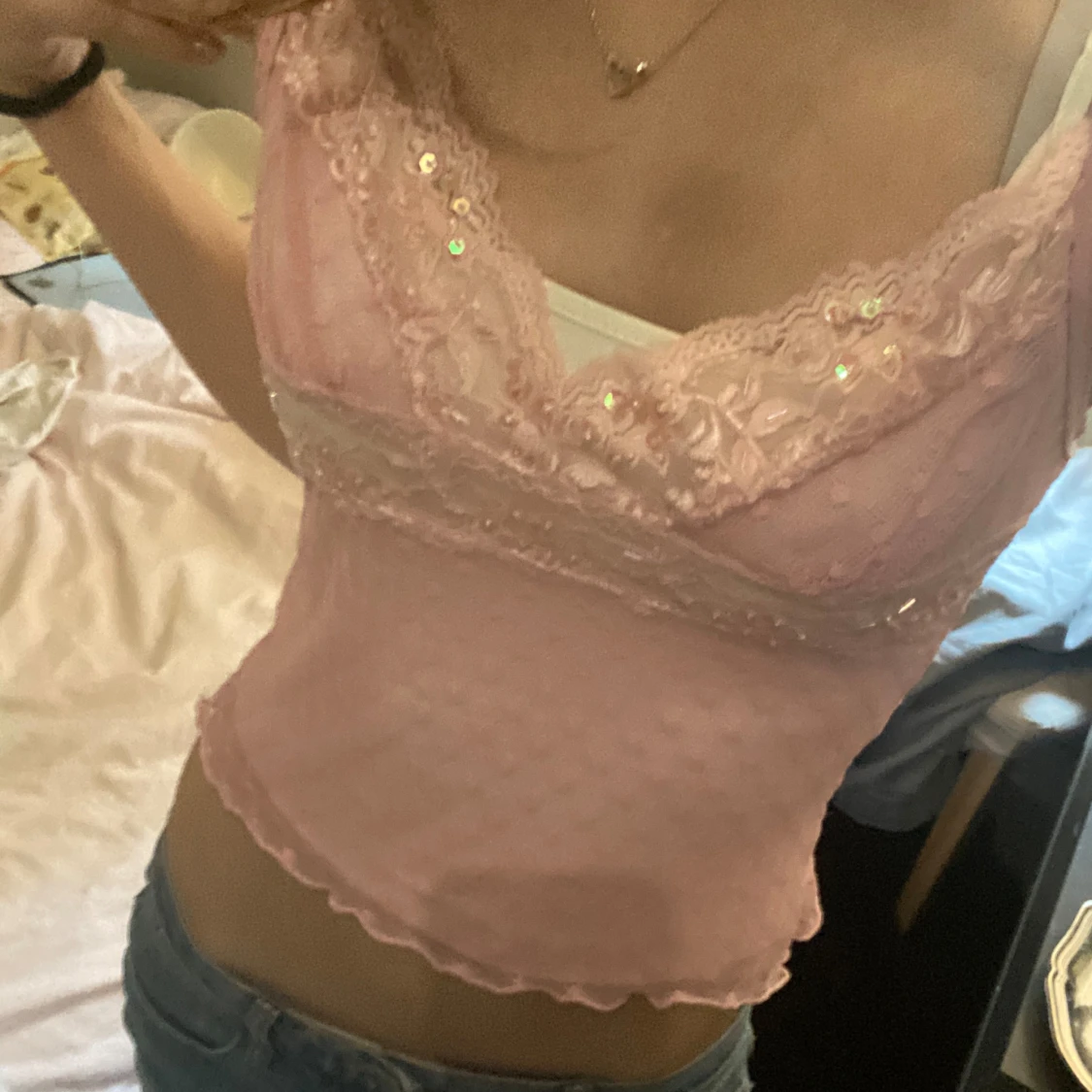 En rosa spets topp med paljetter som inte kommer till användning då jag själv tycker att den är för kort. Den är helt genomskinlig så man måste ha ett linne under (jag har ett vitt linne i bilden) Skriv om ni undrar något mer 💕🫶