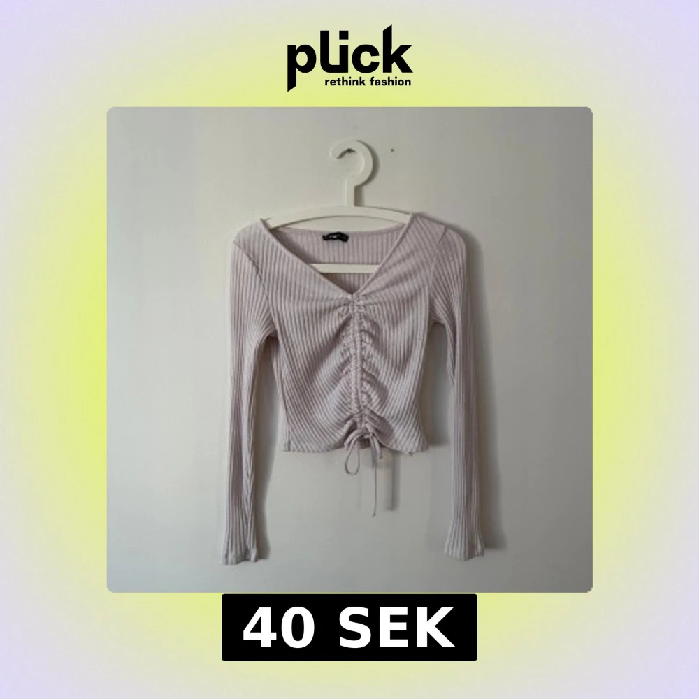 Säljer en ljuslila ribbad topp med v-ringning och knyt framtill. Toppen har långa ärmar och en snygg, figurnära passform. Perfekt för en stilren look!