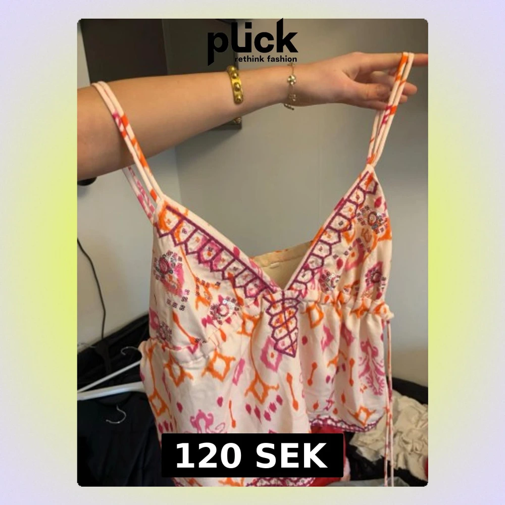 Säljer en färgglad linnetopp med tunna axelband och v-ringning. Toppen har ett rosa, orange och vitt mönster samt broderade detaljer längs ringningen. Perfekt för varma dagar och ger en bohemisk vibe.