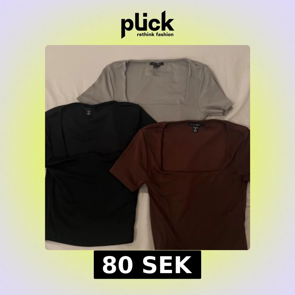 Säljer tre stilrena toppar från Amisu, alla är i storlek M. En svart, en grå och en brun, alla med kort ärm och fyrkantig halsringning. Inte använda, förutom den gråa har jag använt 1-2 ggr. 1 för 80