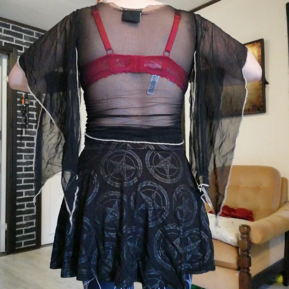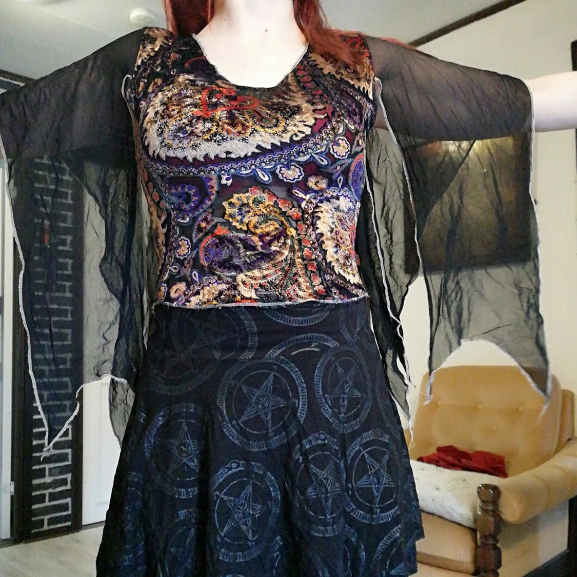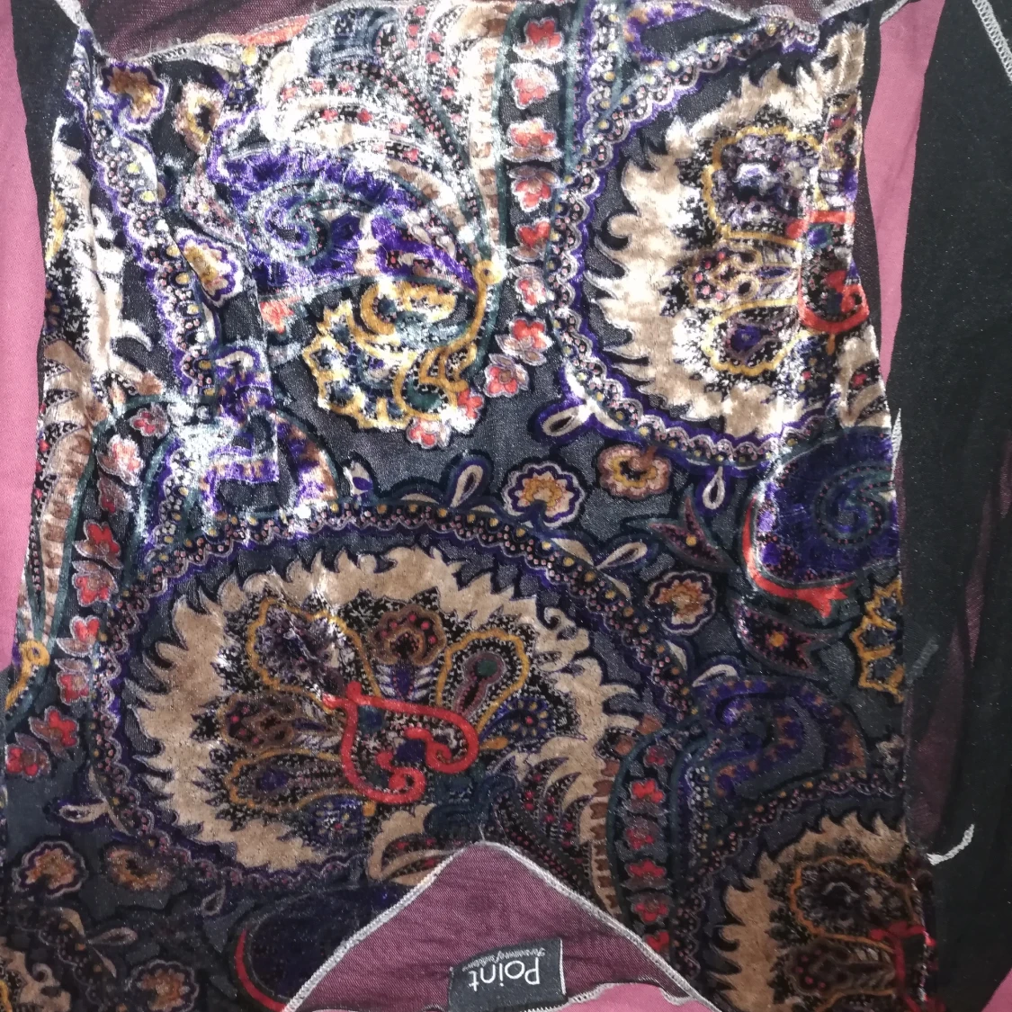 Kläder från när jag var liten 😅Färgglad framsida svart jenomskinligt nät tyg bak till o fladriga armar eller vad man nu kallar doma storlek S men väldigt stretskift tyg märket är point