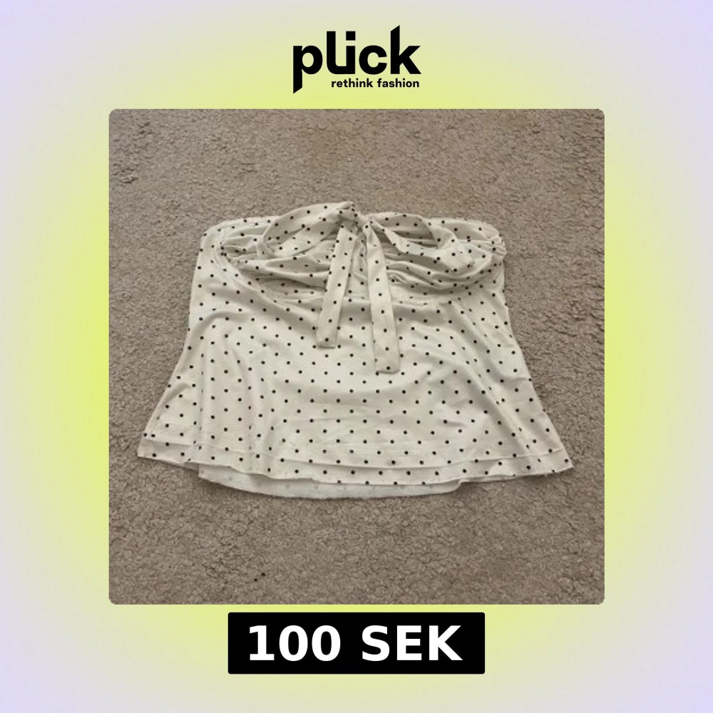 Supersöt vit bandeau tubtopp med svarta prickar och knyt fram. Toppen är ärmlös och har en lätt utsvängd passform. Perfekt för varma dagar och ger en retrovibe. Mjuk och stretchig känsla, troligen i bomull eller polyesterblandning. Jag har sprättat upp toppen längst ner då den ska bli lite längre.
