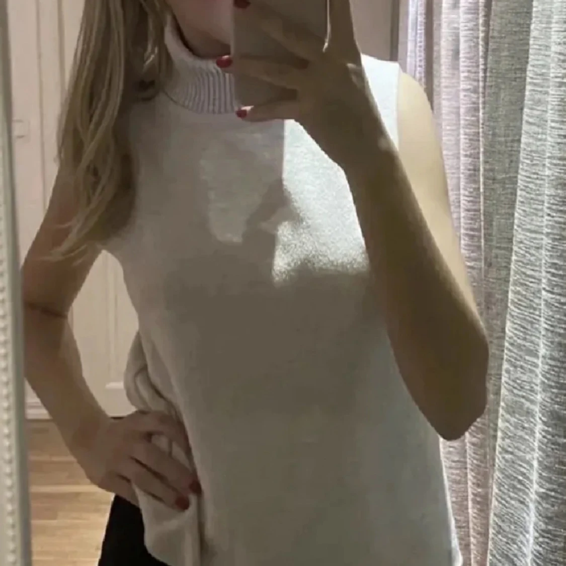 INTRESSEKOLL på denna fina!! Säljer en stilren vit polotopp med ärmlös design och hög, ribbad krage. Toppen har en rak passform och är gjord i ett mjukt stickat material som känns skönt mot huden. Perfekt för dig som gillar minimalistisk och clean stil.
