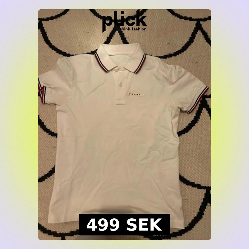 Vit pikétröja från Prada med klassisk krage och knäppning framtill. Tröjan har röda och svarta ränder på krage och ärmslut samt diskret Prada-logga på bröstet. Perfekt för en stilren och sportig look.