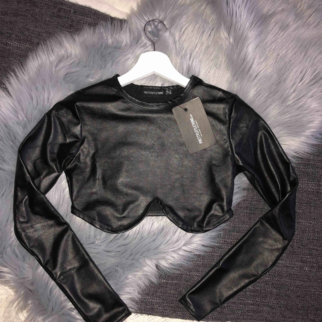 Svart crop top i läderimitation. Beställd från Pretty Little Things nyligen, aldrig använd. Storlek UK 8/ EU 36, men liten i storleken så passar bra som en 34. Frakt ingår inte i priset. Kan dock mötas upp i Stockholm kostnadsfritt!