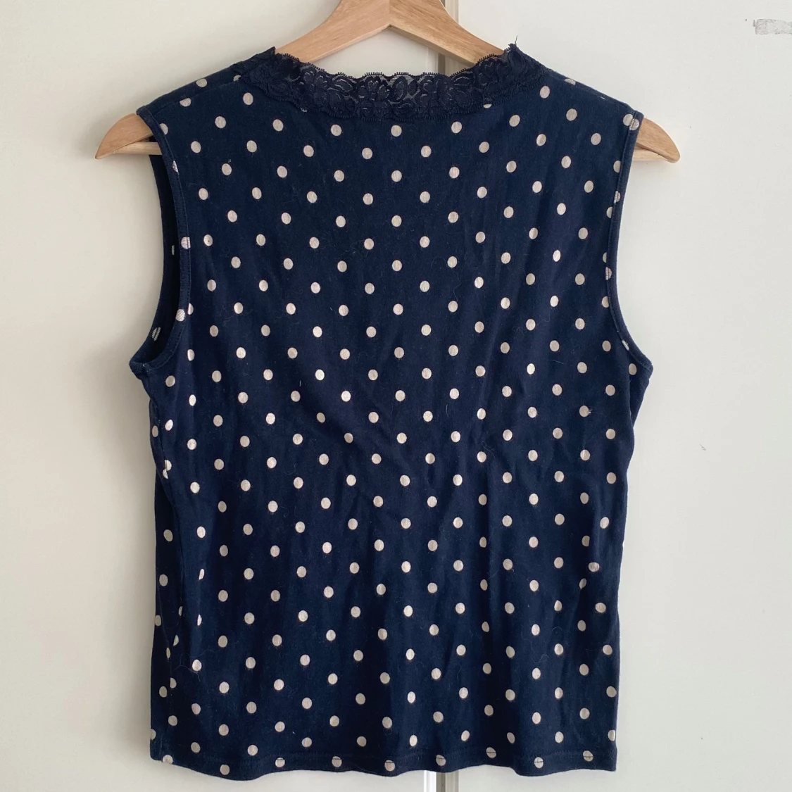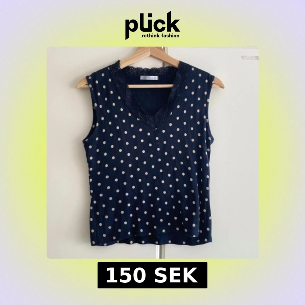 Supersöt svart linnetopp med vita prickar och v-ringning dekorerad med spets. Ärmlös modell som är perfekt för varma dagar. Tidlös och lekfull design som passar till jeans eller kjol.