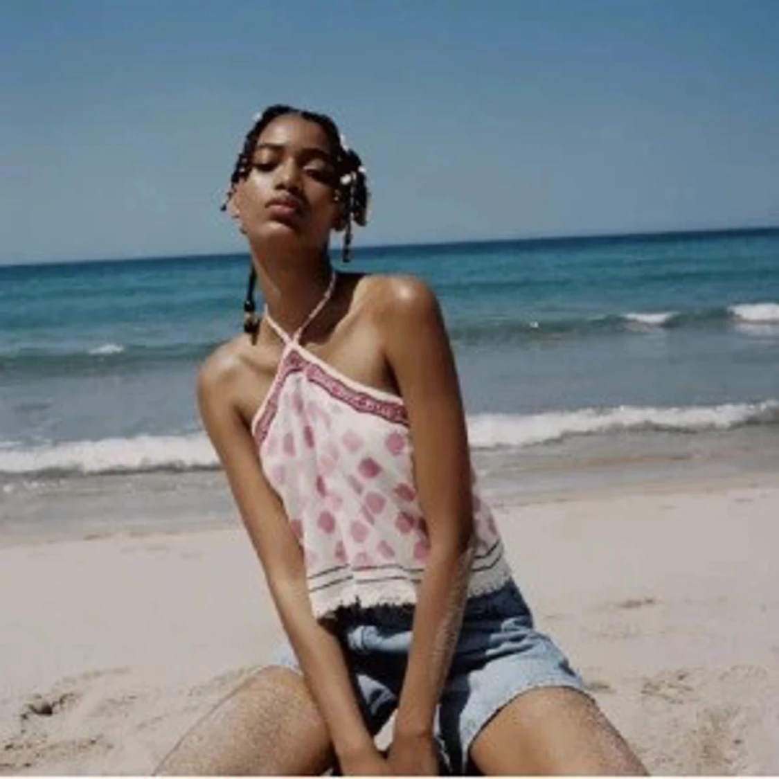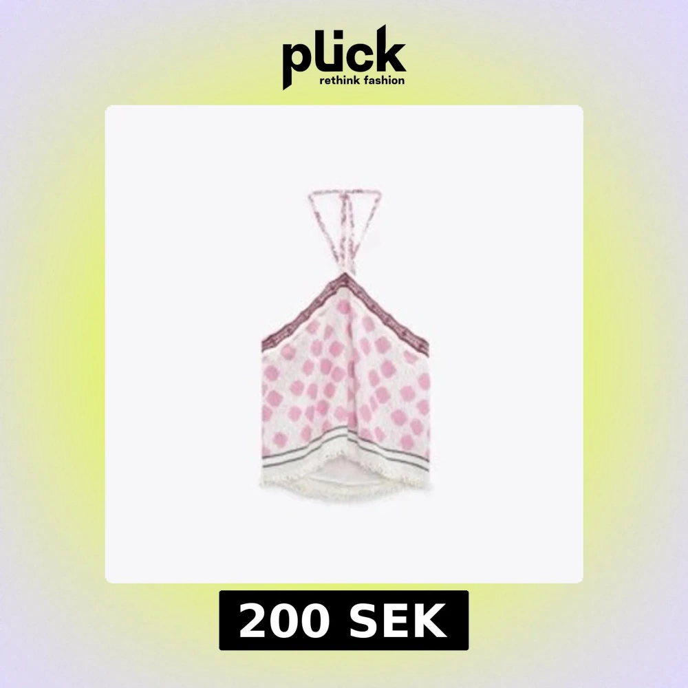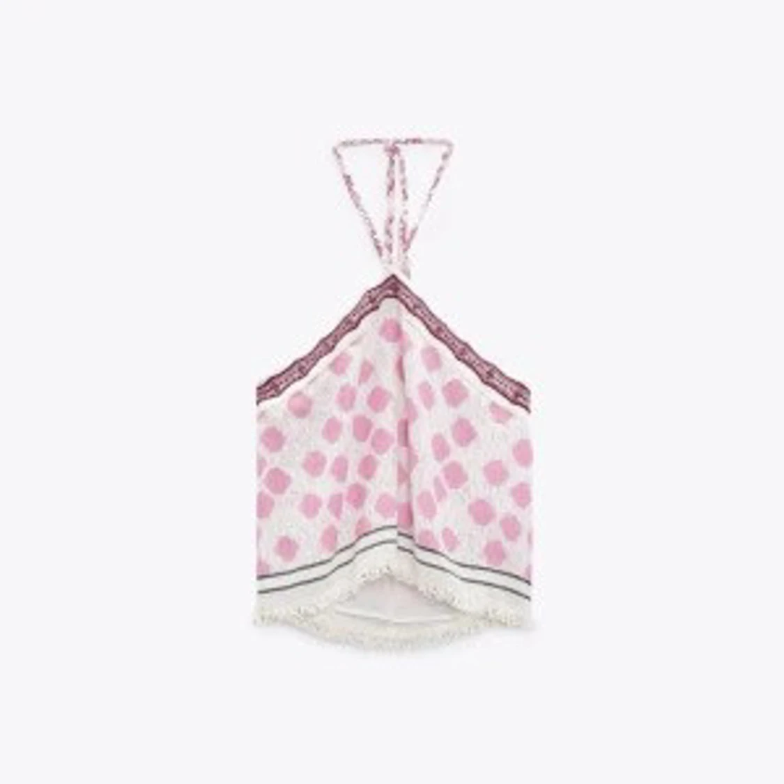 Supersöt halterneck topp från Zara i vitt med rosa prickigt mönster och dekorativ bård upptill. Toppen knyts i nacken och har öppen rygg samt fransig kant nertill. Perfekt för varma dagar och ger en chill sommarvibe.