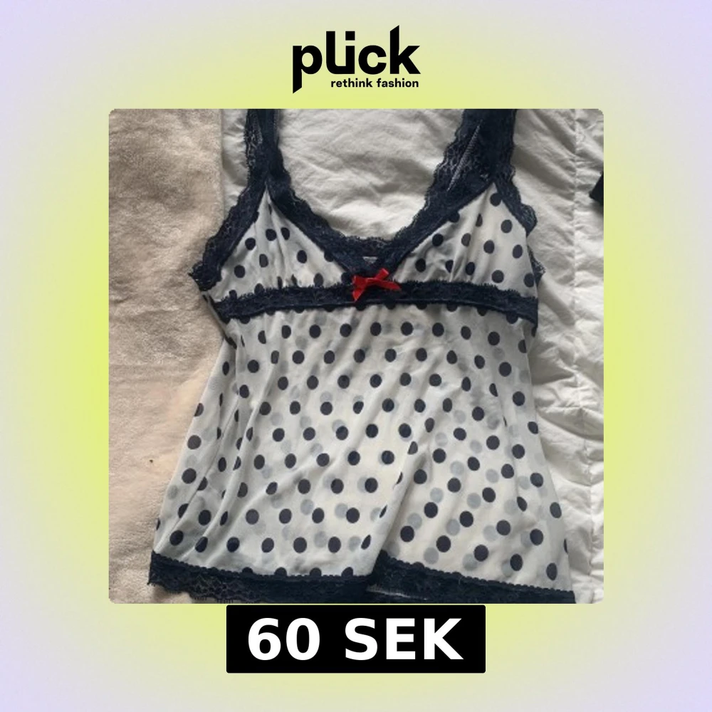 Supersöt vit linnetopp med mörkblå prickar från No Secret. Toppen har spetsdetaljer längs urringning och axelband samt en liten röd rosett framtill. Jag har köpt denna från Plick men aldrig använt den själv