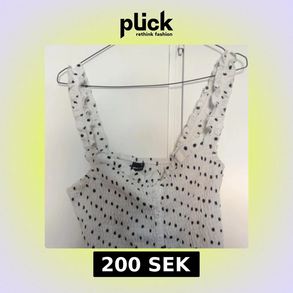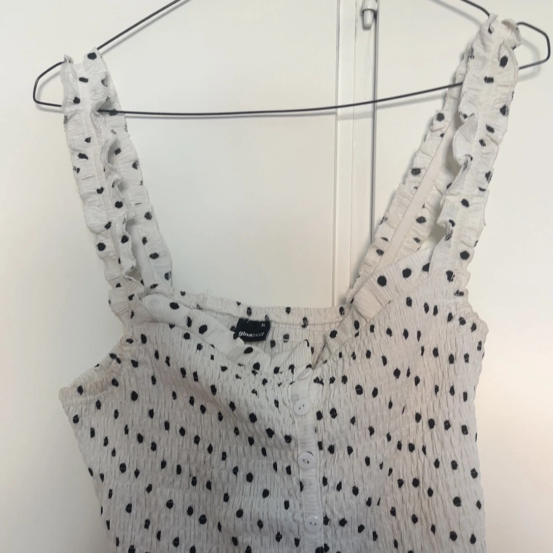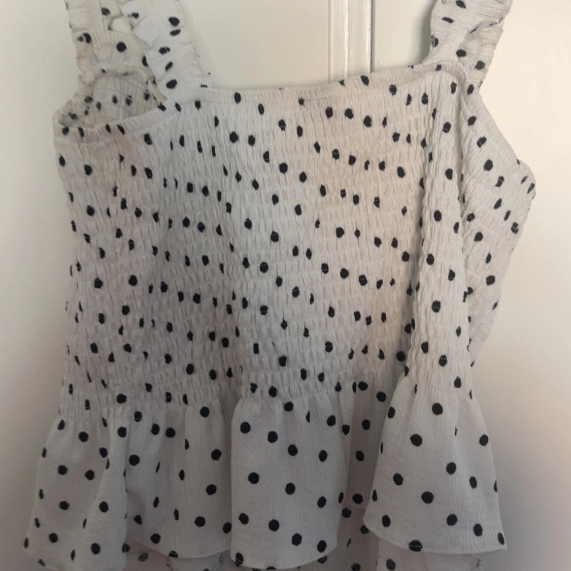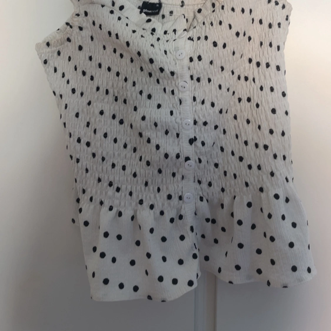 Supersöt vit linnetopp från Gina Tricot med svarta prickar, knappar framtill och breda axelband med volangdetaljer. Toppen har en smockad, stretchig passform och volangkant nedtill. Den är rätt så liten i storleken, jag brukar bära S.