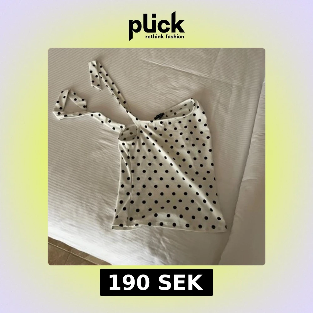 Supersöt vit topp med svarta prickar från Amisu. Modellen är oneshoulder med en bred axelrem som kan knytas. Sitter snyggt och har en slim passform. Perfekt för dig som gillar att sticka ut med ett lekfullt mönster. Materialet är mjukt och stretchigt, troligen polyester.