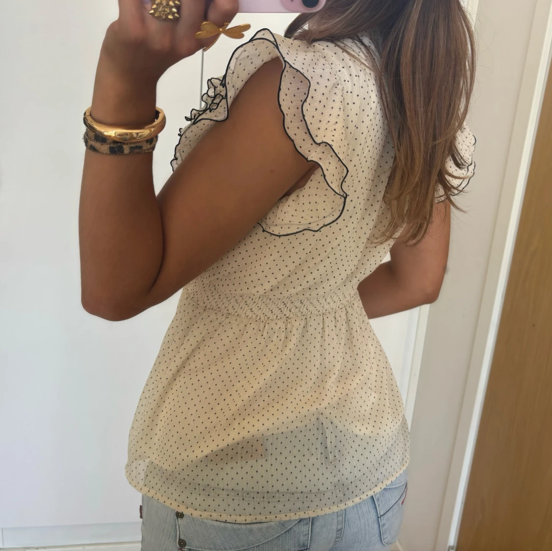 Så söt vringad cremevit prickig volangtopp! Jag är 168 och det är mina bilder, köp via köp nu direkt eller Swish, kvar tills markerad som såld 💖