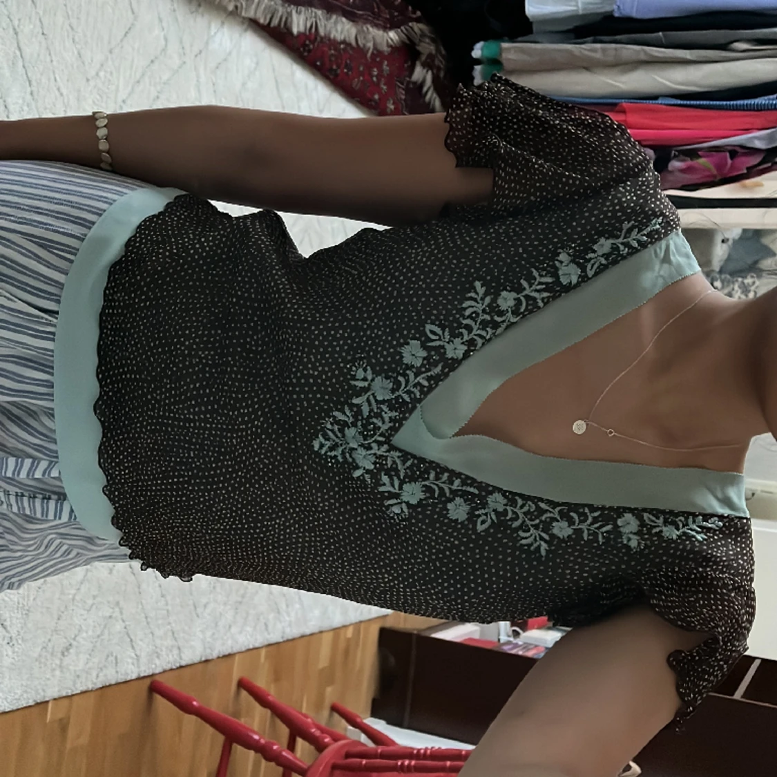Prickig , turkos - blå topp i silke. Fint skick, förutom en liten fläck av läppstift på insidan. Liten, passar bäst xs. Prutbart pris :)