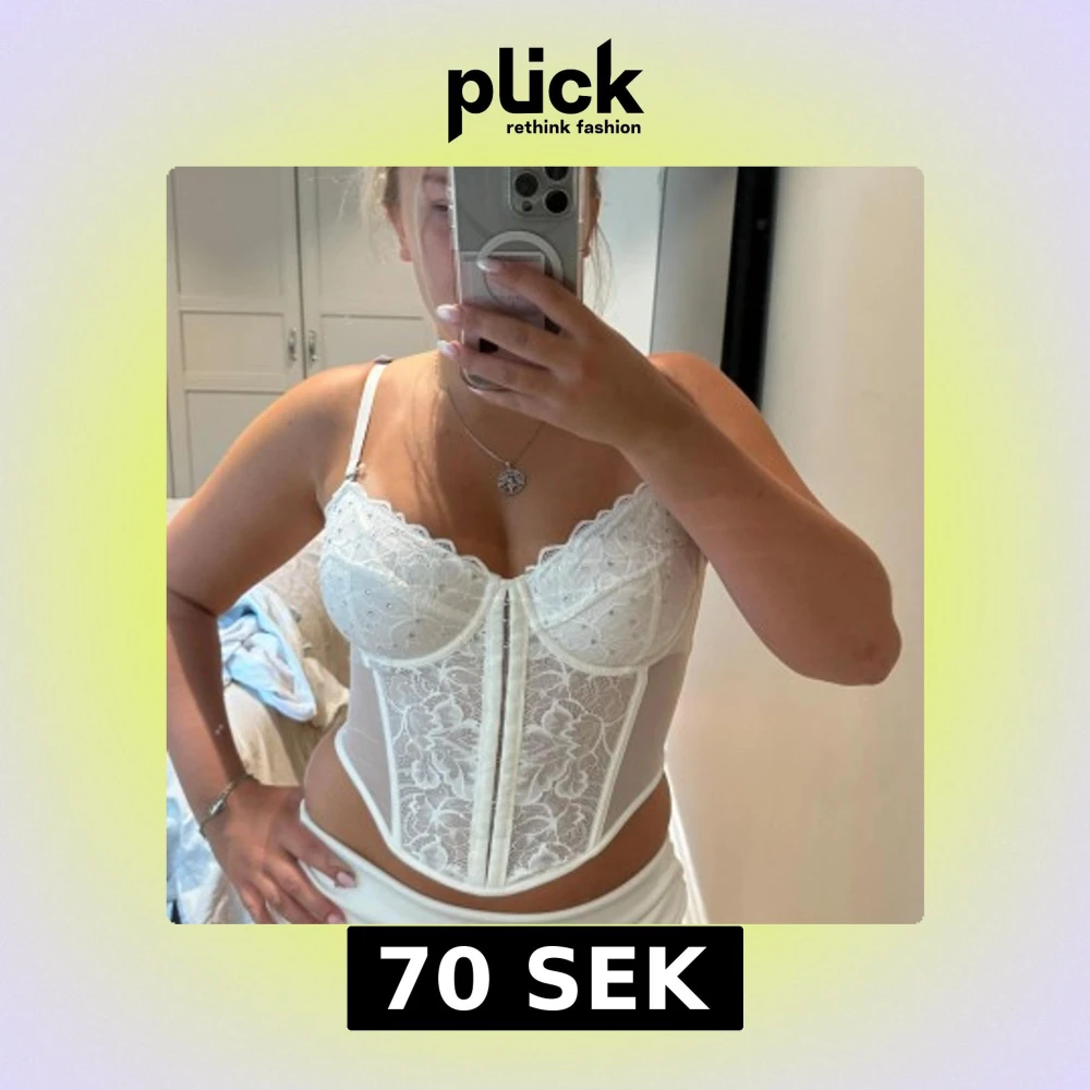 Säljer en vit korsett från Primark Collection med spets och glittriga detaljer. Modellen har reglerbara axelband, genomskinliga meshpartier och hakknäppning framtill. Spetsen har blommigt mönster och små pärlor som ger extra bling. Perfekt för att lyfta din outfit. Aldrig anvönd