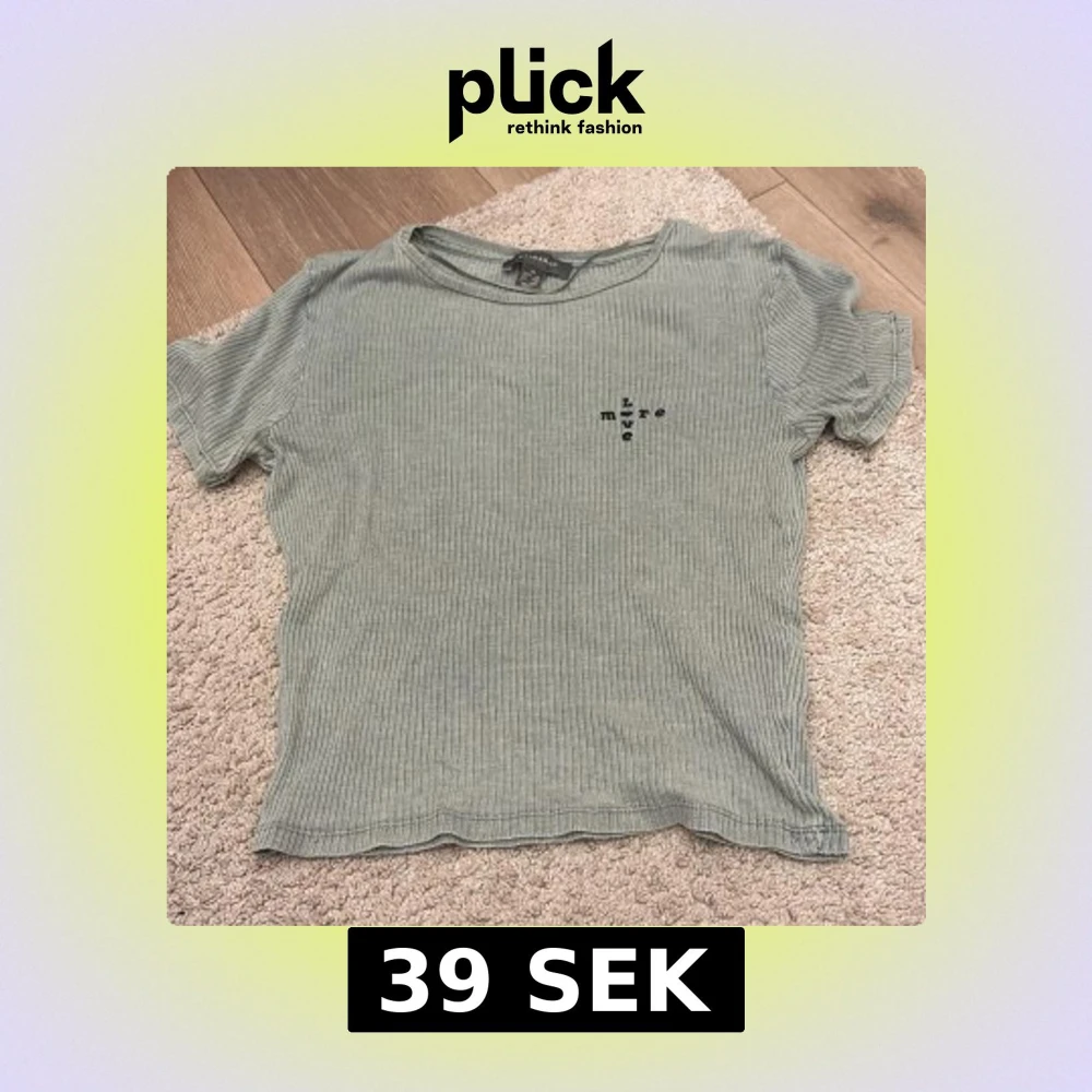 Säljer en ribbad ljusgrön topp från Primark i storlek XS. Toppen har korta ärmar, rund halsringning och ett litet svart tryck med texten 'live more' på bröstet. Perfekt för en chill och avslappnad stil.