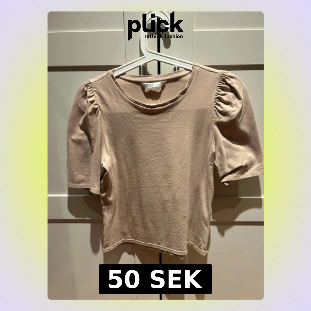 Säljer en beige topp från ONLY med puffiga korta ärmar och rund halsringning. Toppen är i mjuk bomull och har en enkel, stilren design som passar till mycket. Perfekt för dig som gillar en clean look med en twist.