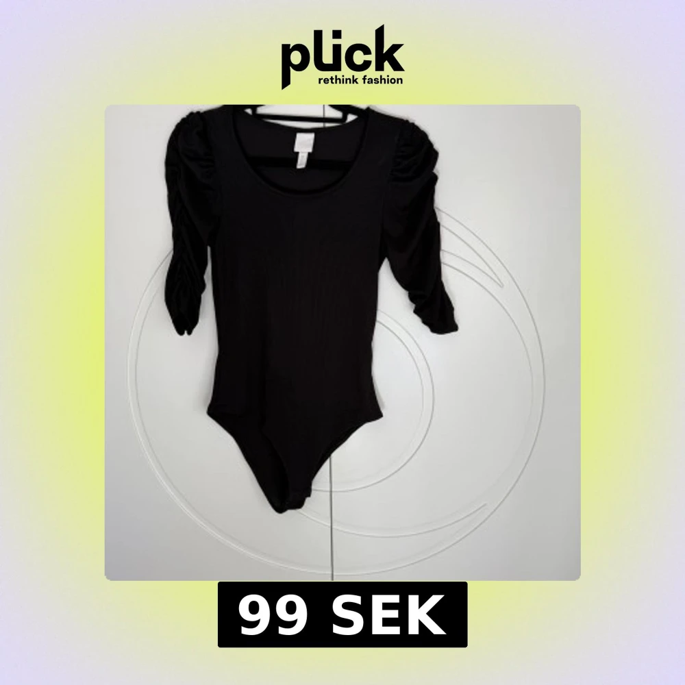 Säljer en svart ribbad body från H&M med snygga puffärmar och rund halsringning. Modellen har trekvartsärm och sitter tight mot kroppen.