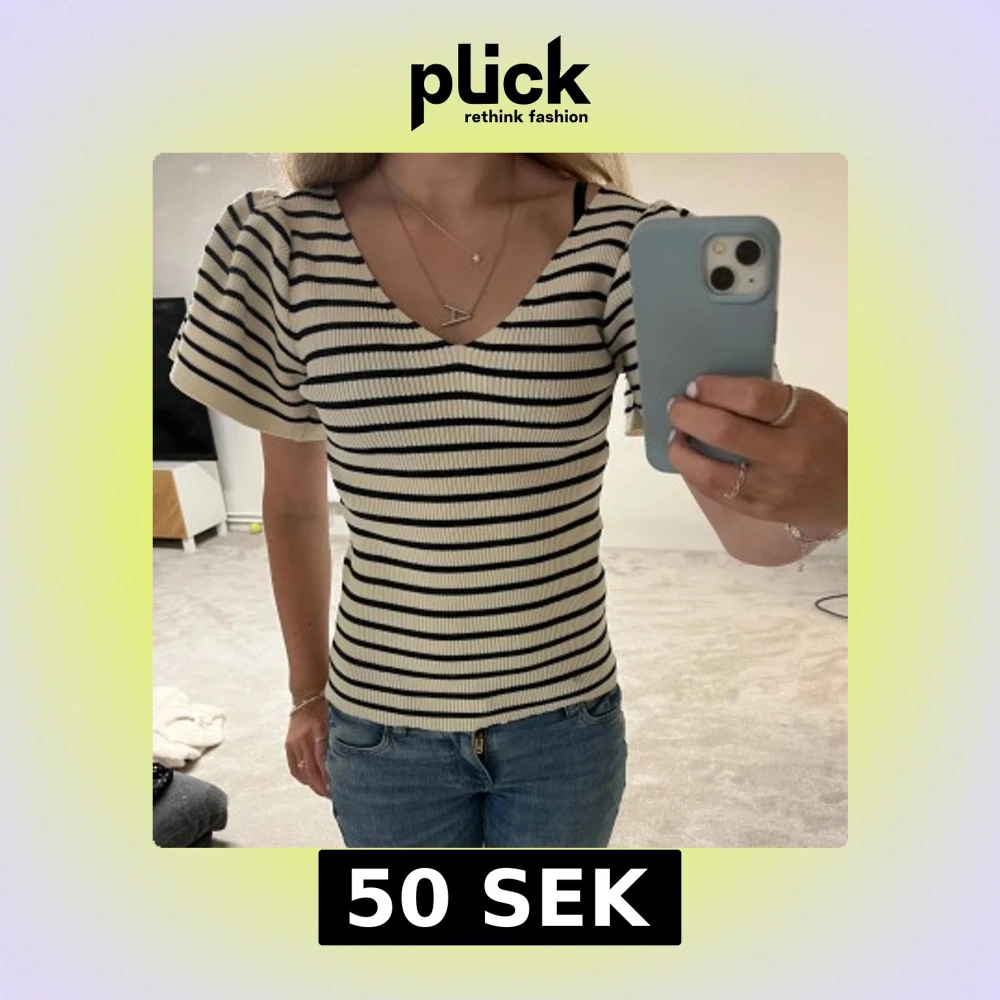 Säljer en snygg ribbad topp från Vero Moda i storlek M. Toppen är vit med mörkblå/svart ränder, har v-ringad hals och korta puffärmar. Super fint skick!