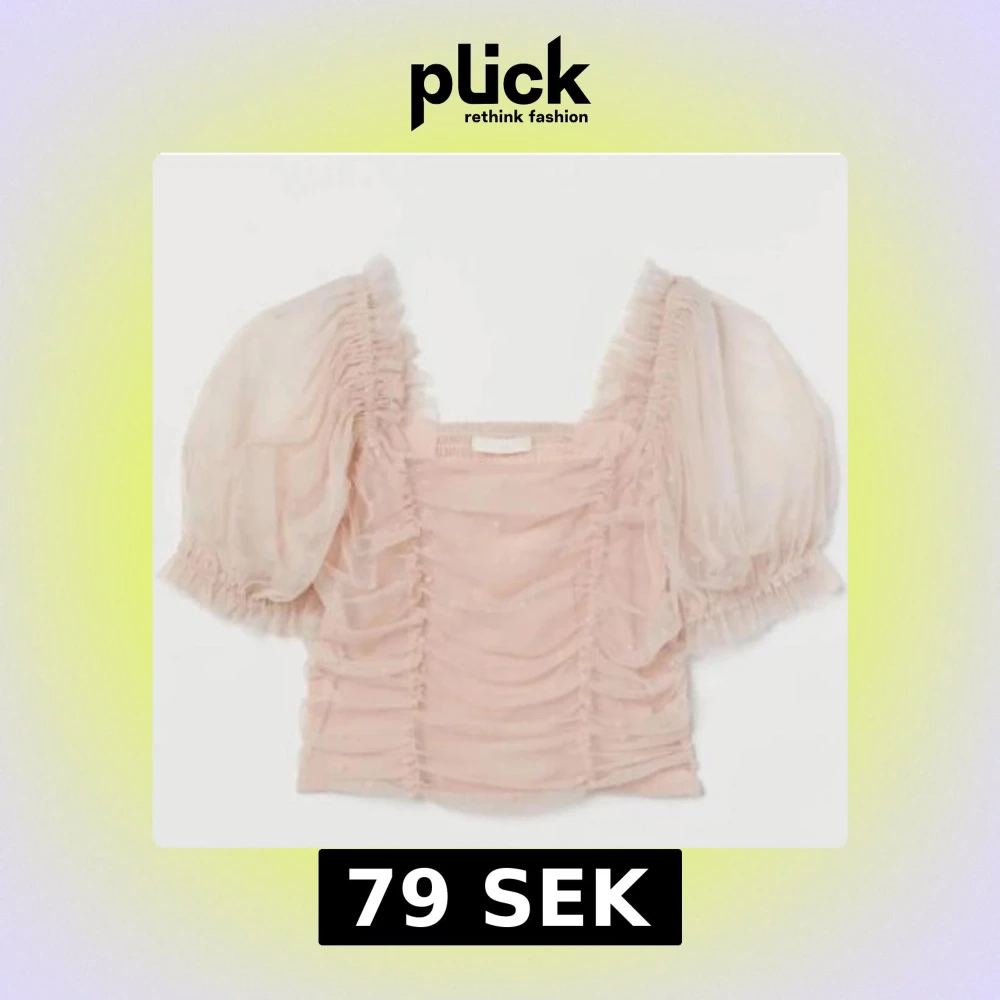 Supersöt ljusrosa blus med puffärmar och transparent mesh. Toppen har rynkade detaljer framtill och små prickar i tyget som ger en extra touch. Fyrkantig urringning och kort, croppad passform.