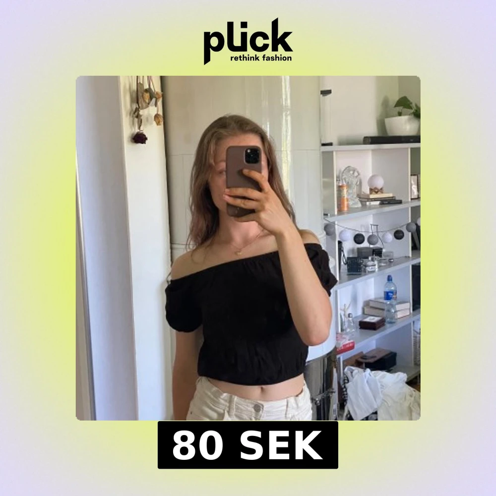 Säljer en svart offshoulder topp från H&M med korta puffärmar och croppad passform. Toppen har en elastisk kant upptill och nertill som ger en snygg siluett. Perfekt till sommaren!
