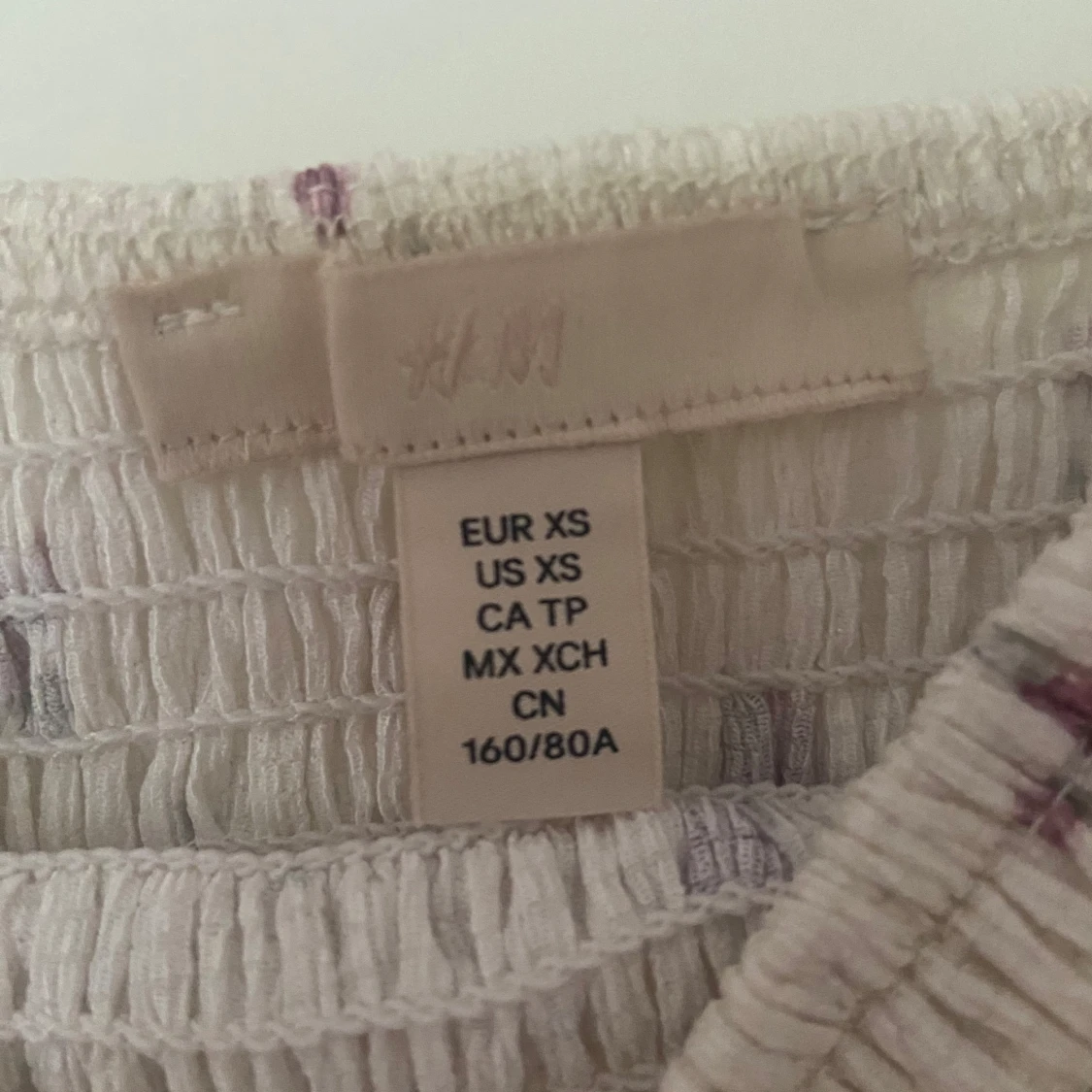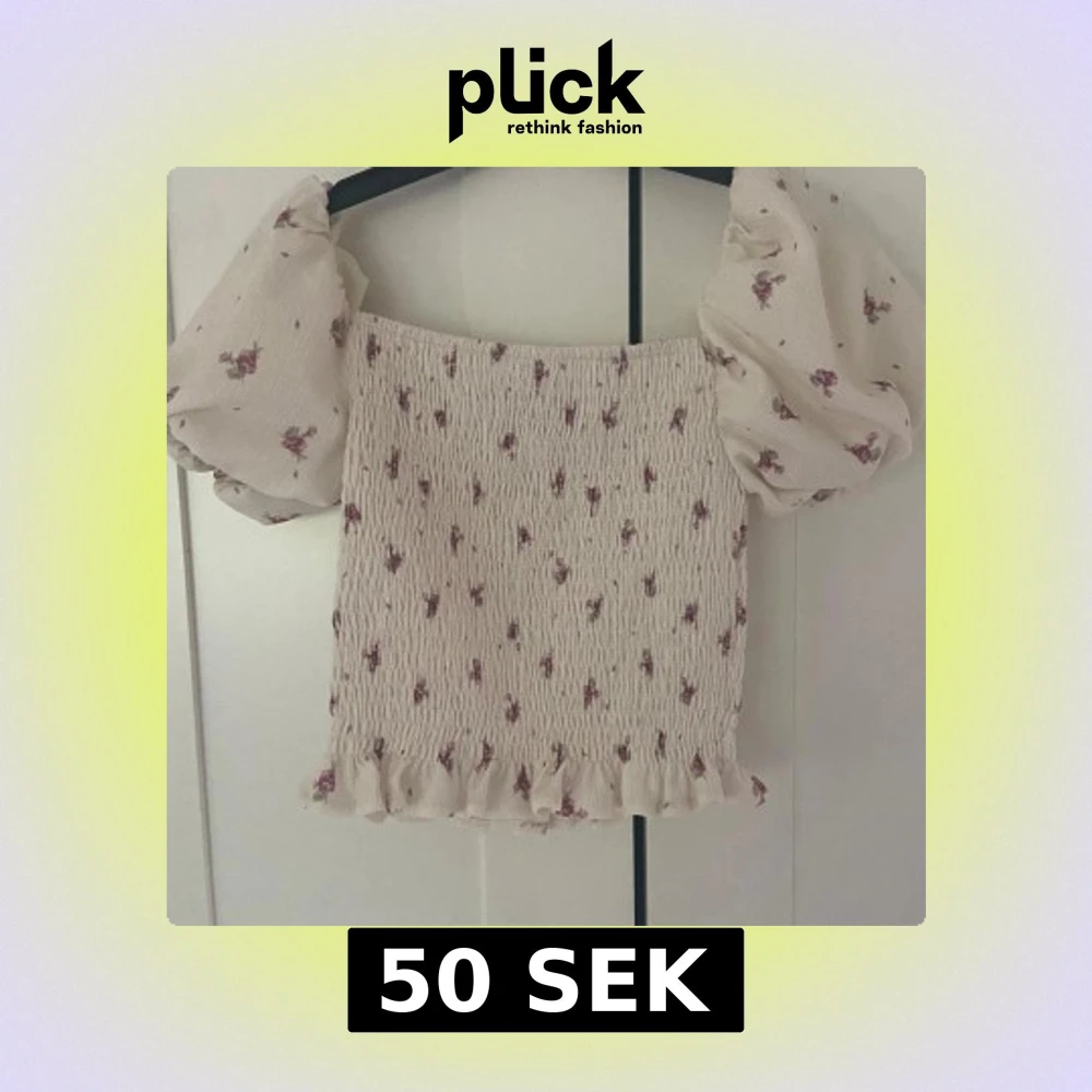 Supersöt offshoulder topp från H&M i ljusbeige med små blommor och puffiga korta ärmar. Smockad kropp och volangkant nertill. Perfekt för en romantisk look!