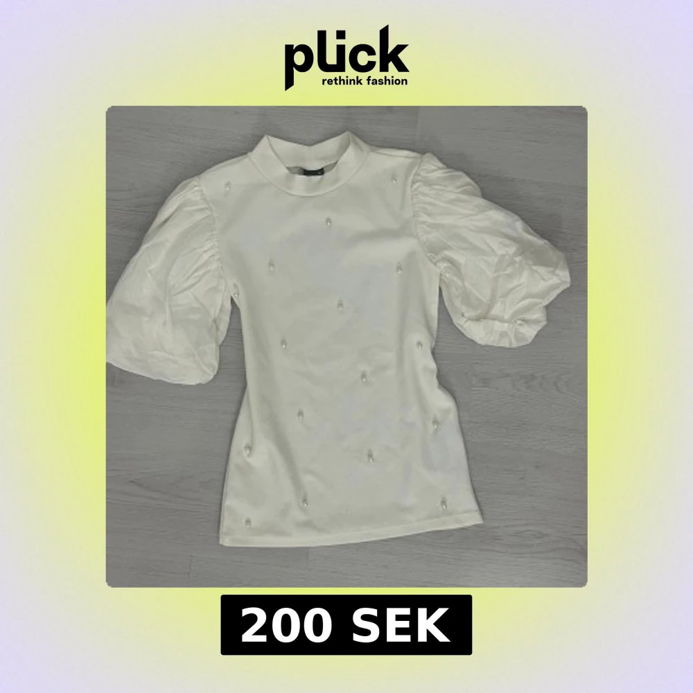 Supersöt vit blus med höga puffärmar och pärldetaljer framtill. Blusen har en rak passform och hög halsringning som ger en trendig look. Perfekt för dig som gillar unika detaljer och vill sticka ut lite extra.