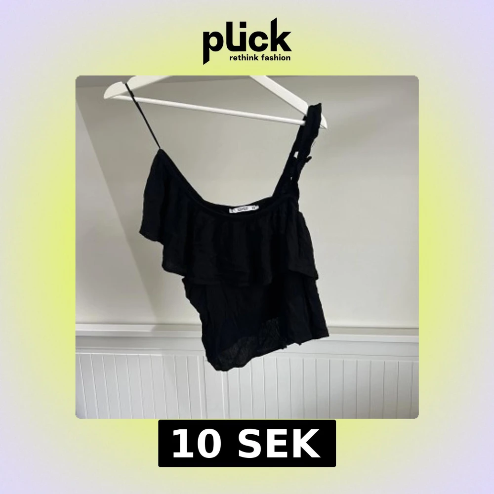 Säljer en svart oneshoulder topp från Pull&Bear i storlek XS. Toppen har volangdetalj och är tillverkad i ett lätt, syntetiskt material. Perfekt för varma dagar eller en snygg layering-look.