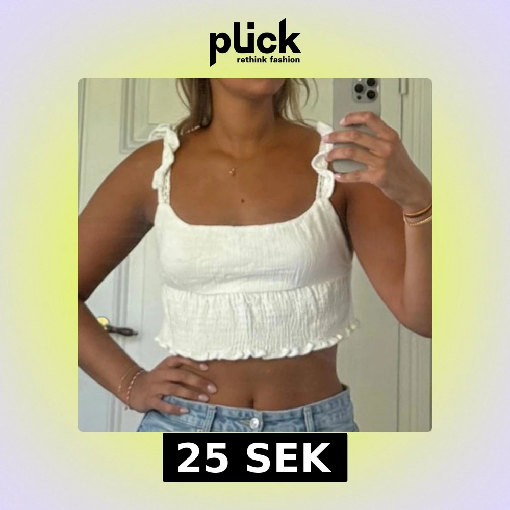 Supersöt vit croppad linnetopp från Pull&Bear med volangdetaljer på axelbanden och längst ner. Storlek L men sitter som M