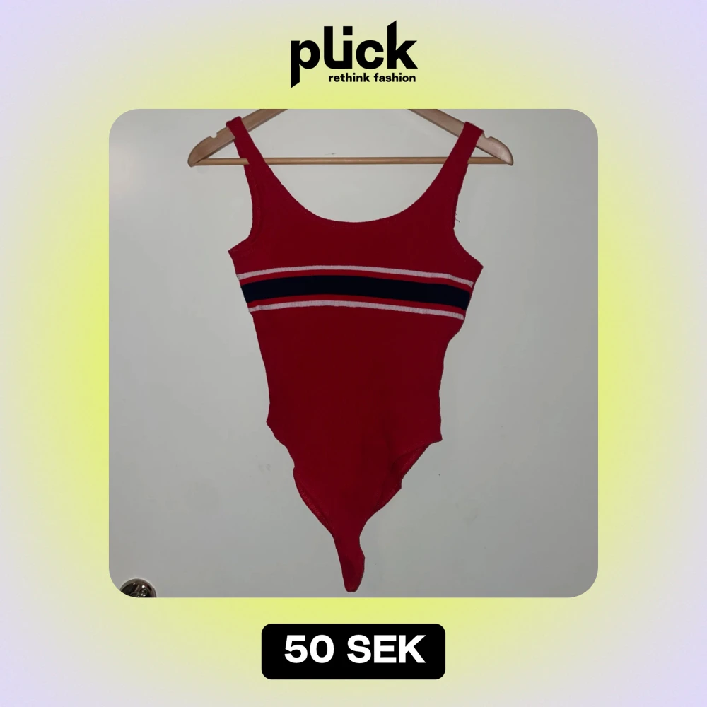 Snygg röd body med breda axelband och en cool randig detalj i marinblått och vitt över bröstet. Låg i ryggen men ej helt öppen. Aldrig använd men haft i min garderob väldigt länge. Storlek M men passar bättre en S.