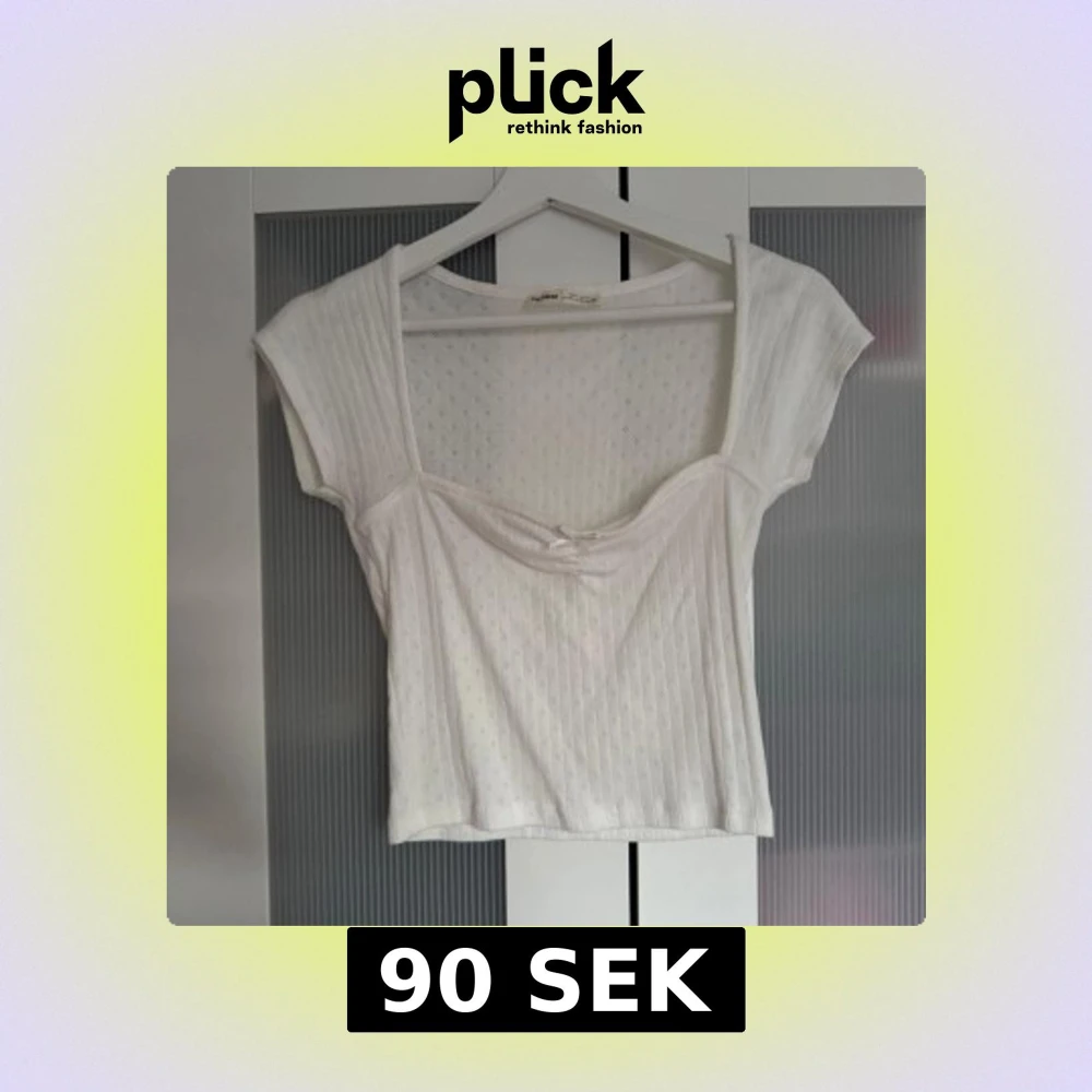 Söt vit topp med små hålmönster och en liten rosett framtill. Toppen har korta ärmar och en djup, fyrkantig urringning. Perfekt för varma dagar. Endast använda en gång. Skriv privat för fler bilder 🩷