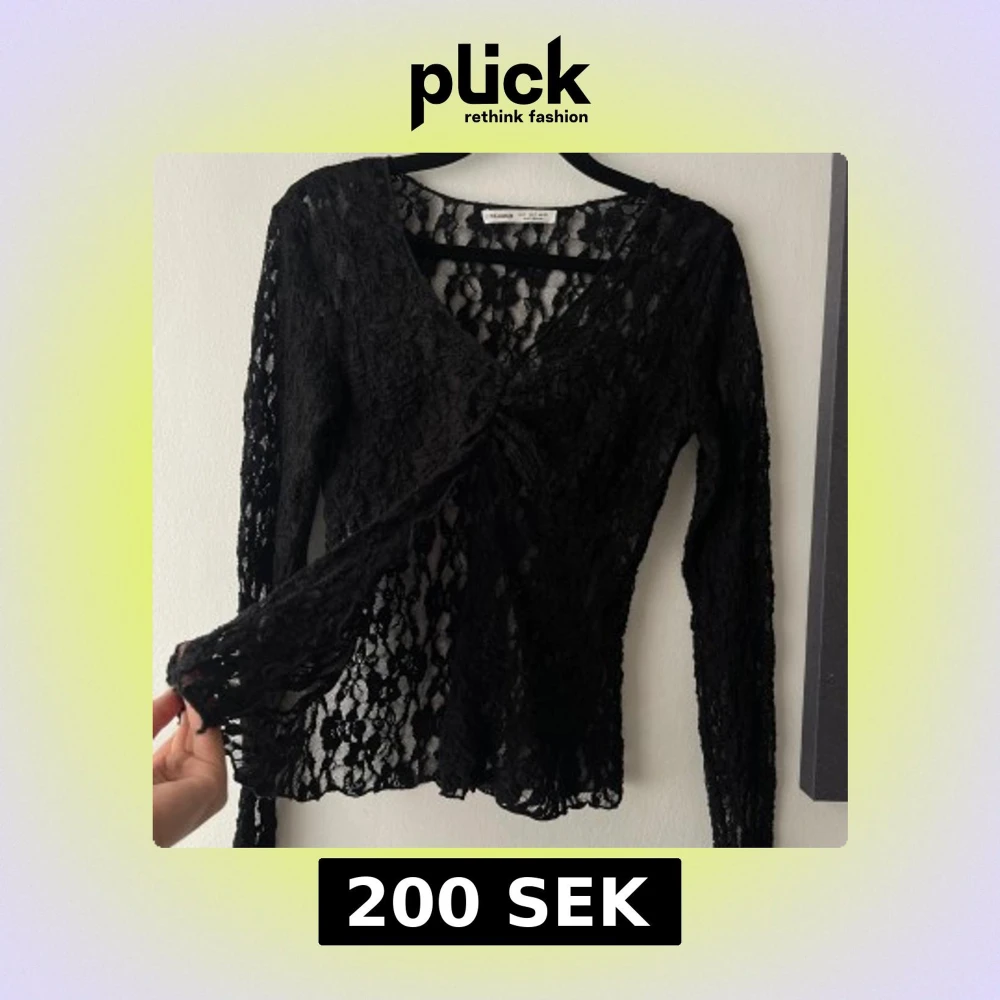 Säljer en svart långärmad blus från Pull&Bear i genombruten spets med v-ringning. Blusen har en omlottkänsla och är perfekt för dig som gillar en edgy och trendig look. Tunn och lätt, med snyggt mönstrad spets som ger en cool vibe.